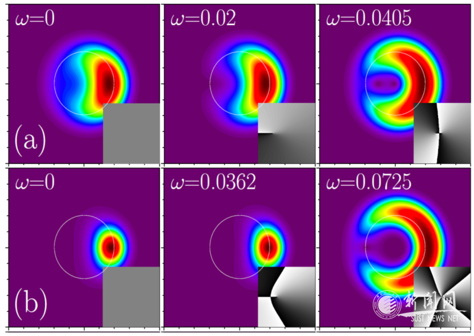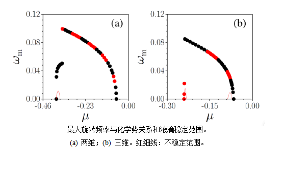 該研究基于失諧勢調制的李-黃-楊修正超平均場GP方程,發(fā)現(xiàn)了新型雙組份BECs中持續(xù)旋轉的超稀量子液滴。這類液滴類似于非線性作用導致的徑向局域化的回音壁模式。隨著化學勢和旋轉頻率的變化,液滴呈現(xiàn)出豐富多樣的形狀。從幾乎平頂?shù)綇娏覂A斜的局域波包,延伸到幾乎整個極角范圍的新月形液滴。臨界旋轉頻率處的液滴轉變?yōu)闇u旋液滴(二維)或渦環(huán)液滴(三維),其拓撲指數(shù)隨化學勢絕對值的增加而增大。旋轉量子液滴幾乎在其整個存在區(qū)間內都很穩(wěn)定。它們是基階和渦旋量子液滴之間的一類基于對稱破缺的新型過渡態(tài)。該研究得到陜西省高層次人才項目、陜西省自然科學基金和我??蒲袉禹椖康闹С帧?/p>