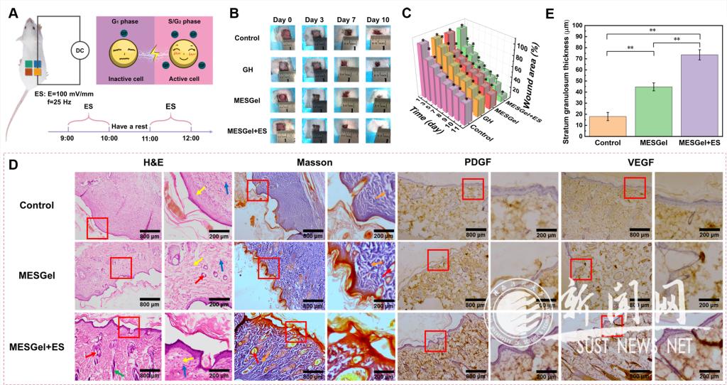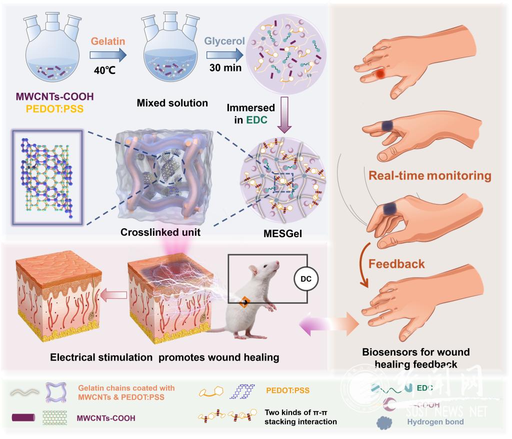該論文以明膠為原料構(gòu)建了多功能仿生電子柔性醫(yī)用電子皮膚。目前,組織化工程支架存在促組織誘導再生能力相對不足、功能單一、與細胞相互作用較差等問題,本研究結(jié)合其智能化、功能化的發(fā)展趨勢與電刺激促細胞生長的基本理念,設計構(gòu)建了一種具有一定機械強度、電活性和自修復性能的水凝膠支架(MESGel),可用于電刺激加速傷口愈合和運動傳感。MESGel具有優(yōu)異的生物相容性和多功能特性,包括柔韌性、自愈合性能、生物降解性和生物電活性。綜合生物實驗證明,MESGel電子皮膚支架能通過電刺激作用,積極促進倉鼠肺上皮細胞的增殖,從而誘導皮膚創(chuàng)傷愈合,為全層皮膚缺損模型提供了一種有效的治療策略。此外,MESGel還可作為一種新型柔性電子皮膚傳感器實時記錄傷口愈合過程的運動信號,有望實現(xiàn)傷口治療-實時監(jiān)測一體化。該研究對生物質(zhì)膠原高值資源化及多功能醫(yī)用支架構(gòu)建提供了新的思路,具有一定的科學研究意義和應用推廣價值。