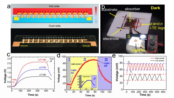 研究人員開(kāi)發(fā)了基于離子熱電效應(yīng)的無(wú)接觸式自供電熱智能探測(cè)器,在較寬的光、熱刺激范圍內(nèi)展現(xiàn)出優(yōu)異的響應(yīng)特性、可重復(fù)性和高靈敏度。同時(shí),研究人員開(kāi)發(fā)出由13對(duì)P-N熱電臂組成的平面式熱傳感器,該傳感器在10K溫差下可產(chǎn)生2.5V電壓且具備高穩(wěn)定性。
