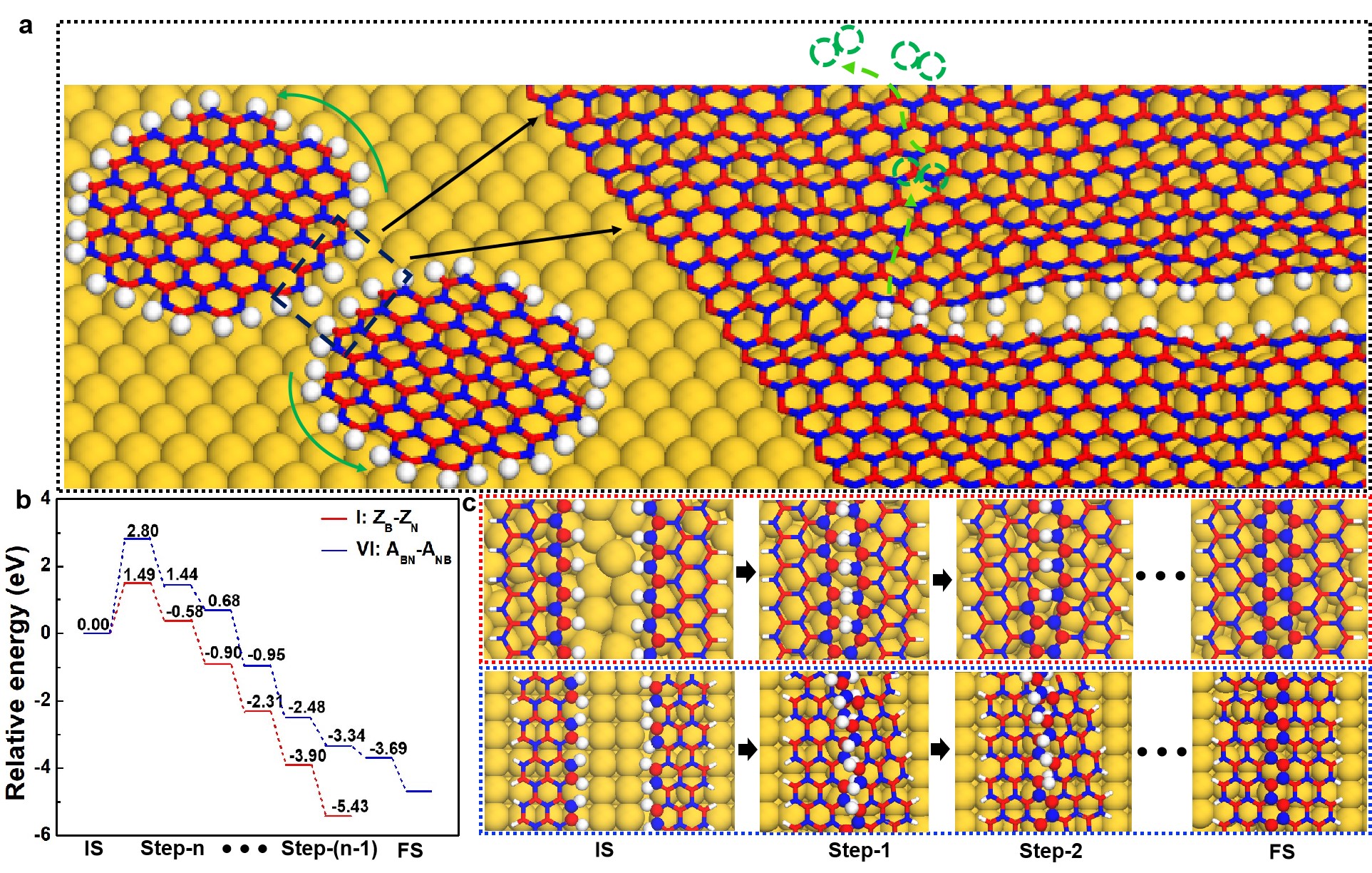 成果1:針對在液態(tài)基底上,不同邊界的二維晶疇能否通過無縫融合實(shí)現(xiàn)晶圓級單晶生長這一至今尚不清楚的科學(xué)問題。電智學(xué)院丁利蘋副教授與韓國蔚山基礎(chǔ)科學(xué)研究院丁峰教授合作在“ACS Nano 2022, 15, 19387”上發(fā)表題為“Mechanism of 2D Materials Seamless-Coalescences on Liquid Substrate”的論文。以六方氮化硼(hBN)在液態(tài)金表面的生長為例,系統(tǒng)研究了不同邊界的hBN晶疇無縫融合過程。從靜態(tài)計(jì)算到分子動(dòng)力學(xué)模擬,全面探究大尺寸、高質(zhì)量晶圓級hBN單晶生長的微觀機(jī)理。丁利蘋副教授為論文第一作者,我校文理學(xué)院邵鵬副教授為論文第二作者。