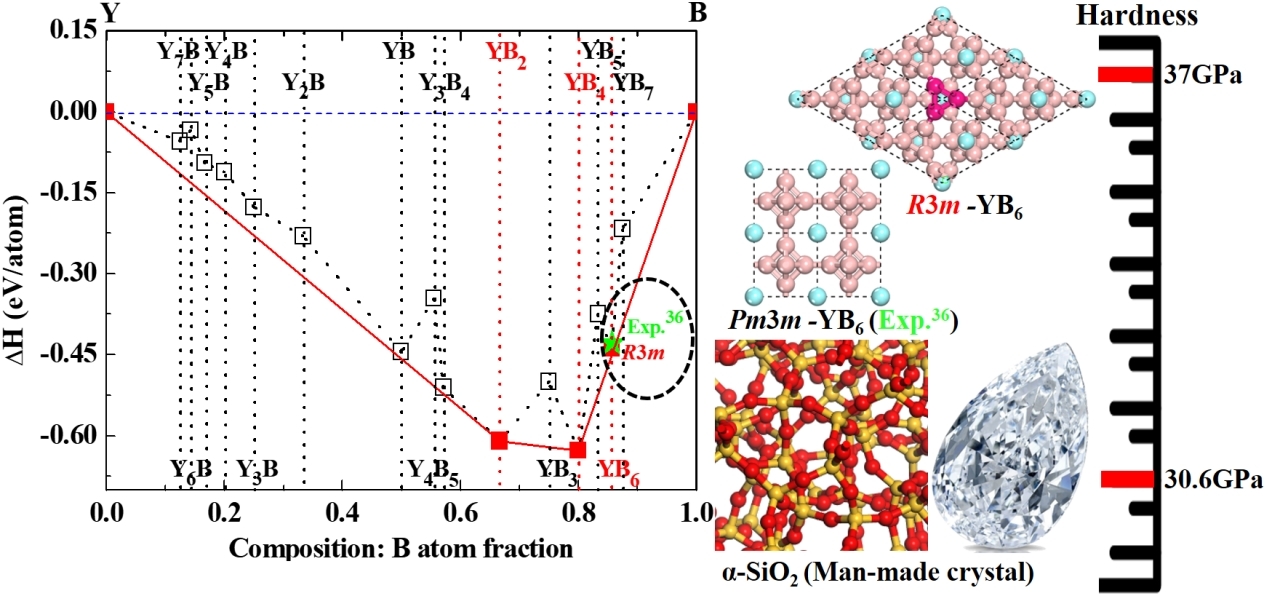 成果3:硼化釔因其超導(dǎo)性和高化學(xué)穩(wěn)定性而備受關(guān)注。然而,硼化釔的機(jī)械性能和硬度的相關(guān)知識還不清楚?;贑ALYPSO全局結(jié)構(gòu)搜索技術(shù)和第一性原理,對不同化學(xué)配比的硼化釔進(jìn)行了系統(tǒng)研究。結(jié)果預(yù)測了一種具有R3m六方結(jié)構(gòu)的新型硼釔化合物YB6,與實(shí)驗(yàn)合成的Pm3?m結(jié)構(gòu)相比,預(yù)測的R3m-YB6更穩(wěn)定。計(jì)算的生成焓、彈性常數(shù)和聲子譜清晰的表明,R3m-YB6具有較高的機(jī)械穩(wěn)定性和動(dòng)力學(xué)穩(wěn)定性。電子態(tài)密度和能帶結(jié)構(gòu)顯示,所有穩(wěn)定的硼酸釔都具有金屬性?;谖覀冮_發(fā)的半經(jīng)驗(yàn)硬度公式,計(jì)算R3m-YB6的維氏硬度為37.0 GPa,表明它是一種潛在的超硬金屬。該研究為實(shí)驗(yàn)合成超硬硼化釔晶體提供理論依據(jù)。該研究成果發(fā)表于自然指數(shù)期刊“Journal of Physical Chemistry Letter 12, 5423-5429 ”。丁利蘋副教授為第一作者,邵鵬副教授為共同通訊作者。