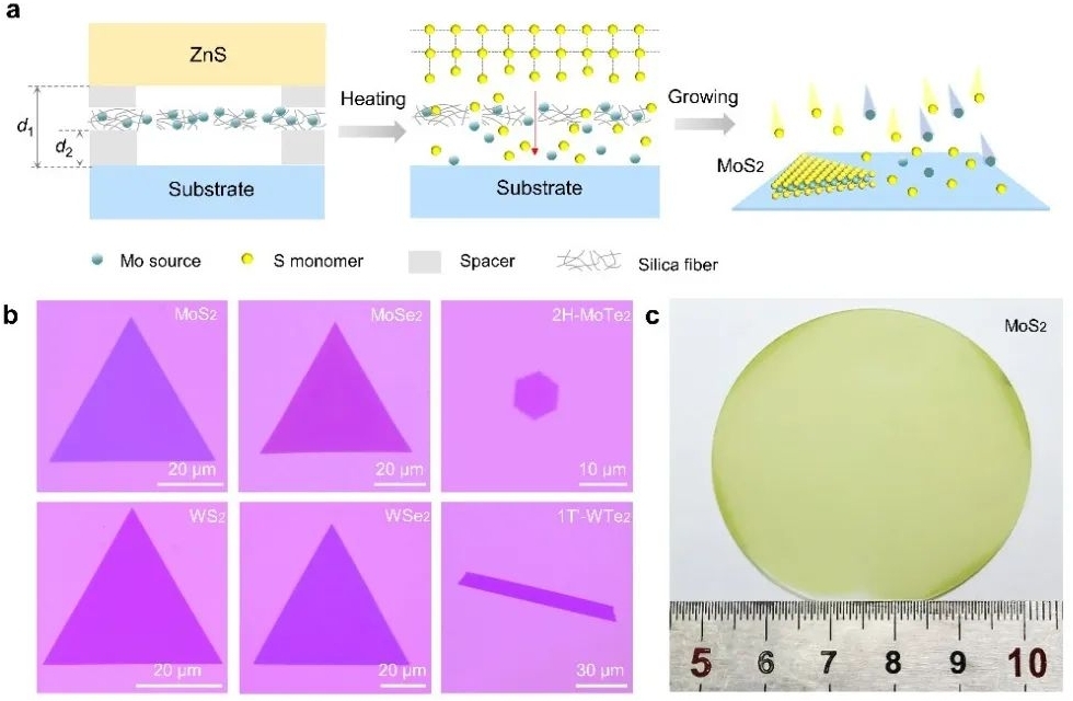 成果2:丁利蘋副教授與北京大學(xué)王恩哥院士、劉開輝教授,南方科技大學(xué)俞大鵬院士、韓國基礎(chǔ)科學(xué)研究院丁峰教授等合作,針對目前常規(guī)方法中采用升華硫單質(zhì)制備二維半導(dǎo)體TMDs中存在高密度硫空位的問題,提出了一種表界面硫族單原子供應(yīng)制備高品質(zhì)TMDs及其合金的新方法。該方法通過設(shè)計(jì)局域空間,成功實(shí)現(xiàn)低缺陷密度、優(yōu)異光學(xué)和電學(xué)特性的單層MX2(M=Mo、W;X=S、Se、Te)晶圓制備,并首次報(bào)道了四元合金MoS2(1-x-y)Se2xTe2y的可控合成。該成果被推薦為“中國半導(dǎo)體十大研究進(jìn)展候選”(新聞鏈接https://mp.weixin.qq.com/s/RI5UCUCUgQSigi2vkGW3nQ)。相關(guān)研究成果發(fā)表于“Nature Communications 13, 1007”雜志上。左勇剛、劉燦、丁利蘋、喬瑞喜為論文共同第一作者;北京大學(xué)劉開輝、韓國基礎(chǔ)科學(xué)研究院丁峰、中國科學(xué)院物理研究所白雪冬和北京大學(xué)博士后劉燦為共同通訊作者。