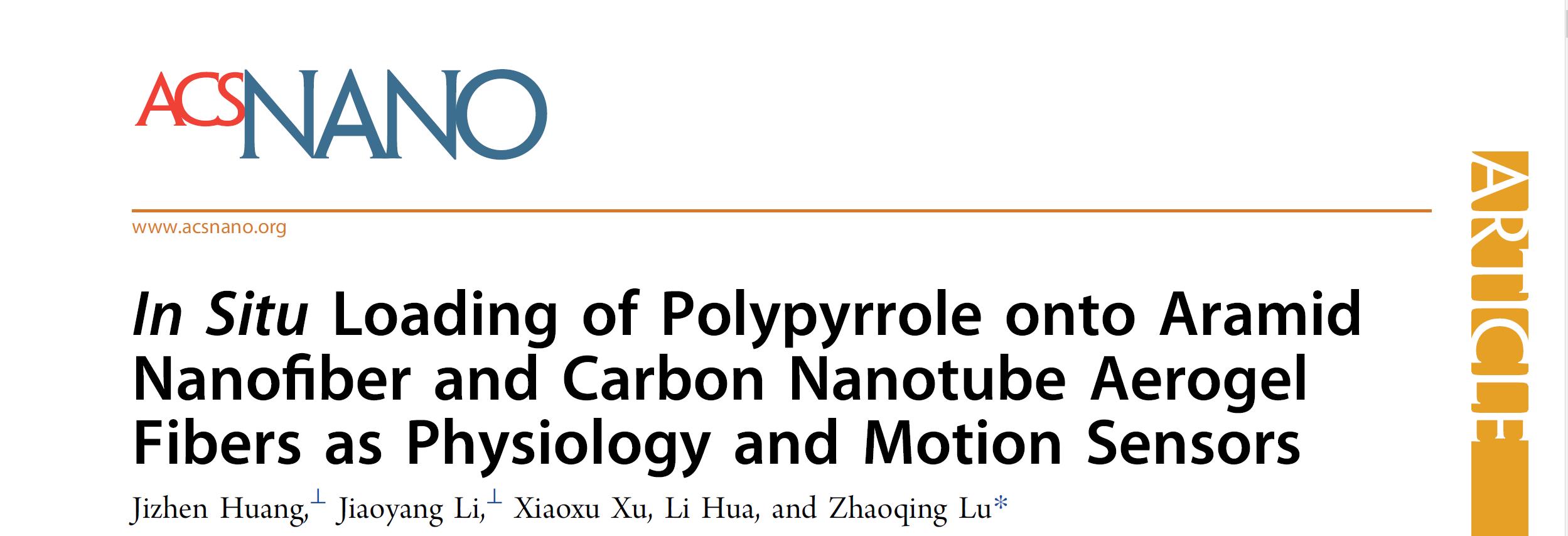 近日,我校輕工科學(xué)與工程學(xué)院陸趙情教授團隊在國際材料領(lǐng)域頂級期刊《ACS Nano》(IF=15.881)上發(fā)表題為“In Situ Loading of Polypyrrole onto Aramid Nanofiber and Carbon Nanotube Aerogel Fibers as Physiology and Motion Sensors”的研究論文。該研究涉及柔性電子技術(shù)與人機交互領(lǐng)域,為芳綸纖維在柔性可穿戴電子設(shè)備的應(yīng)用上提供支撐,擴寬了我校高性能纖維材料信息化和輕質(zhì)化的發(fā)展方向。我校為論文的唯一通訊單位,博士生黃吉振為第一作者,陸趙情教授為通訊作者。