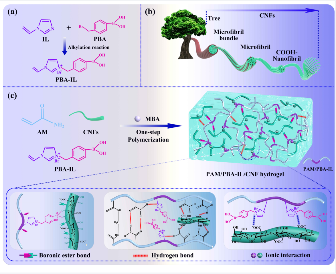 近年來(lái),柔軟、靈活和智能的離子導(dǎo)電水凝膠具有優(yōu)異的機(jī)械性能和穩(wěn)定性、高靈敏度和導(dǎo)電性,在可穿戴設(shè)備、可植入器件、軟機(jī)器人、人造皮膚以及人機(jī)交互系統(tǒng)等領(lǐng)域有廣闊應(yīng)用前景。然而,通過(guò)簡(jiǎn)單一步法構(gòu)筑同時(shí)具有優(yōu)異機(jī)械性能、高離子導(dǎo)電率、自修復(fù)、自粘附、保水性仍然是一個(gè)挑戰(zhàn)。有鑒于此,該論文通過(guò)設(shè)計(jì)一種多功能性苯硼酸離子液體(PBA-IL)單體,在納米纖維素(CNF)存在下,通過(guò)PBA-IL/丙烯酰胺(AM)一步聚合法,制備了一種具有半互穿網(wǎng)絡(luò)結(jié)構(gòu)的離子導(dǎo)電水凝膠(PAM/PBA-IL/CNF),該離子導(dǎo)電水凝膠能同時(shí)實(shí)現(xiàn)優(yōu)異機(jī)械性、導(dǎo)電性和多功能性的集成。我校為論文的唯一通訊單位,2019級(jí)碩士研究生姚雪為第一作者,張素風(fēng)教授和錢立偉副教授為該論文的共同通訊作者。