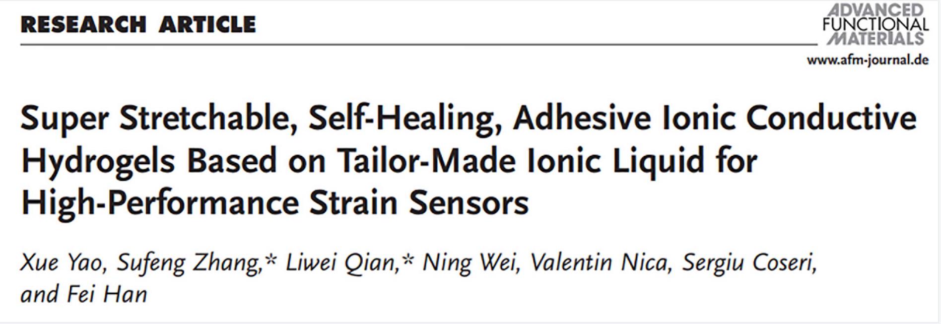 近日,我校輕工科學(xué)與工程學(xué)院張素風(fēng)教授團(tuán)隊(duì)在國(guó)際材料領(lǐng)域頂級(jí)期刊《Advanced Functional Materials》(IF=19.924)上發(fā)表題為“Super Stretchable, Self-Healing, Adhesive Ionic Conductive Hydrogels Based on Tailor-Made Ionic Liquid for High-Performance Strain Sensors”的研究論文。