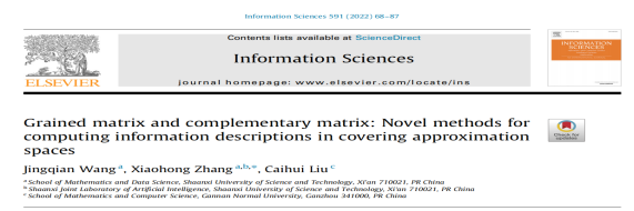 [3]Jingqian Wang, Xiaohong Zhang*, Caihui Liu, Grained matrix and complementary matrix: novel methods for computing information descriptions in covering approximation spaces, Information Sciences, 2022, 591: 68-87.