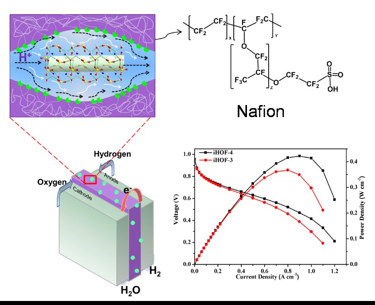 我校化學(xué)與化工學(xué)院曹麗慧教授開展的研究工作利用酸性與堿性有機(jī)分子構(gòu)筑酸堿對的原理制備雙組分離子型HOFs材料,通過離子交換反應(yīng)制備了具有DBpy·2I和萘二磺酸化合物的四種雙組分離子型HOF。研究結(jié)果表明,具有不同磺酸基配體位置的四種iHOF顯示出四種不同的氫鍵結(jié)構(gòu)。阻抗譜測量表明,iHOF-3和iHOF-4的質(zhì)子電導(dǎo)率可以分別達(dá)到1.16 × 10-3和2.76 × 10-3S·cm-1。iHOF/Nafion復(fù)合膜作為固體電解質(zhì)的燃料電池測試初步研究表明,6%-iHOF-4/Nafion的最大功率密度可達(dá)到0.42 W·cm-2,6%-iHOF-3/Nafion可達(dá)到0.36 W·cm-2。隨著對此類材料的進(jìn)一步研究,將會設(shè)計(jì)出更多具有高質(zhì)子傳導(dǎo)性的iHOFs,這將在燃料電池領(lǐng)域顯示出巨大的潛力。