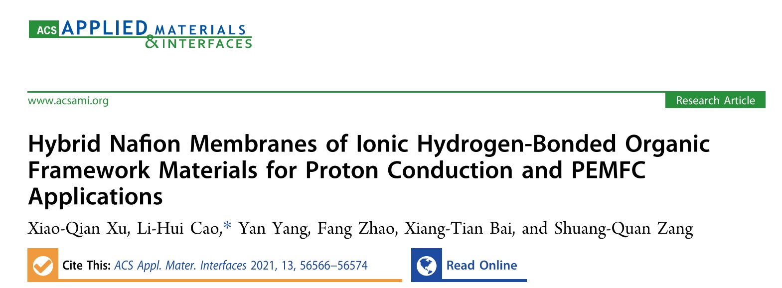 相關(guān)成果以“Hybrid Nafion Membranes of Ionic Hydrogen-Bonded Organic Framework Materials for Proton Conduction and PEMFC Applications”為題,發(fā)表在ACS Applied Materials & Interfaces(IF = 10.383)上。陜西科技大學(xué)為論文第一通訊單位,化工學(xué)院2018級碩士研究生徐小倩為該論文的第一作者,曹麗慧教授為第二作者和論文唯一通訊作者。