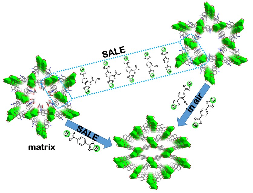 金屬有機(jī)框架(MOF)作為一類功能性多孔晶態(tài)框架材料,由于其可控的結(jié)構(gòu)和潛在的應(yīng)用,引起了人們的廣泛關(guān)注。其結(jié)構(gòu)的修飾與改良,性質(zhì)功能的調(diào)控和提升一直是該領(lǐng)域的研究重點(diǎn)。近幾年科學(xué)家們開發(fā)了一種通過逐步反應(yīng)實(shí)現(xiàn)配位聚合物多功能化的復(fù)雜合成策略——溶劑輔助連接體交換(SALE)。溶劑輔助連接體交換是指將配位聚合物作為母體加入到含有高濃度的外加有機(jī)配體溶液中反應(yīng),外加配體替換原配合物中的配體形成與母體具有相似框架的產(chǎn)物。通過合成后修飾(PSM)策略可以合成更復(fù)雜和多功能化的MOF材料。此外,由于其獨(dú)特的物理化學(xué)性能與結(jié)構(gòu)息息相關(guān),MOF材料在外部條件的刺激下可能會發(fā)生結(jié)構(gòu)轉(zhuǎn)變。作為研究結(jié)構(gòu)改變引起性能變化的理想模型,功能性晶態(tài)框架MOF材料在光、熱、壓力或pH值等外部刺激作用下結(jié)構(gòu)和性質(zhì)上的開關(guān)行為吸引了科學(xué)家們越來越多的關(guān)注。