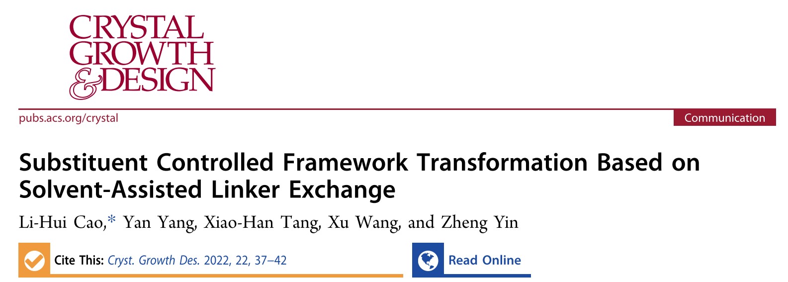 相關(guān)成果以“Substituent Controlled Framework Transformation Based on Solvent-Assisted Linker Exchange”為題,發(fā)表在Crystal Growth & Design上(IF = 4.010)上。陜西科技大學(xué)為論文唯一通訊單位,曹麗慧教授為第一作者和論文唯一通訊作者,化工學(xué)院2019級碩士研究生楊妍為該論文的第二作者。