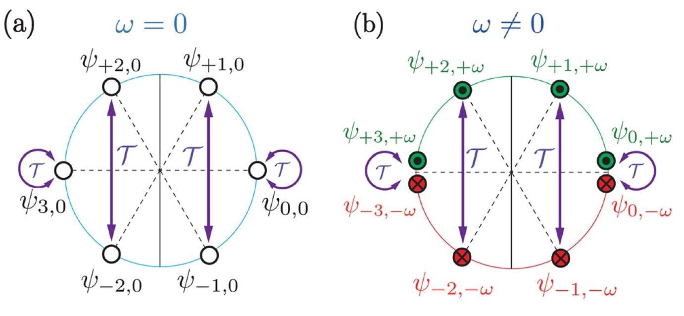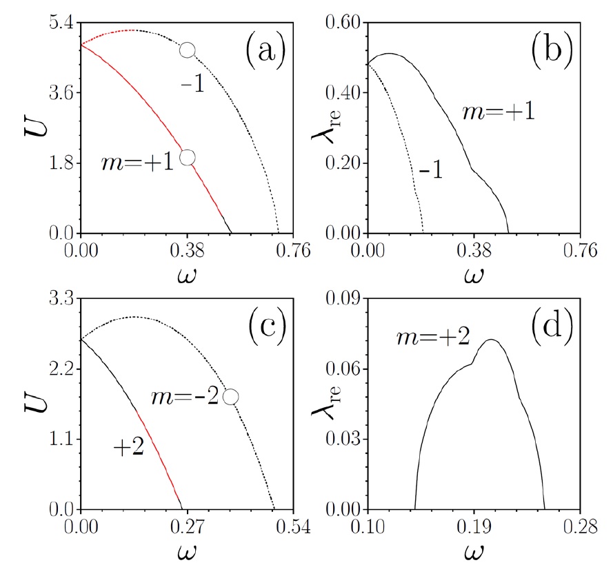 本項(xiàng)工作的創(chuàng)新點(diǎn)為,基于旋轉(zhuǎn)體系中的非線性薛定諤方程,研究了扭曲環(huán)形波導(dǎo)陣列中拓?fù)鋺B(tài)的形成。發(fā)現(xiàn)非線性介質(zhì)中波導(dǎo)陣列的扭曲導(dǎo)致具有相反拓?fù)浜傻臏u旋孤子表現(xiàn)出完全不同的基本性質(zhì)。該系統(tǒng)中順時(shí)針和逆時(shí)針渦旋流的不等價(jià)性非常罕見。通過對具有C6v離散旋轉(zhuǎn)對稱性波導(dǎo)陣列的分析,我們發(fā)現(xiàn)縱向扭曲能夠穩(wěn)定拓?fù)浜勺畹蜑榈臏u旋孤子,這類渦旋在具有相同對稱性但未扭曲的陣列中總是不穩(wěn)定的。扭曲還會導(dǎo)致原本穩(wěn)定的孤子出現(xiàn)不穩(wěn)定區(qū)域,并產(chǎn)生在非扭曲陣列中被禁止的拓?fù)浜蔀閙=3的渦旋模。我們建立了陣列的離散旋轉(zhuǎn)對稱性、扭轉(zhuǎn)方向和可能的孤子拓?fù)浜芍g的嚴(yán)格關(guān)系。