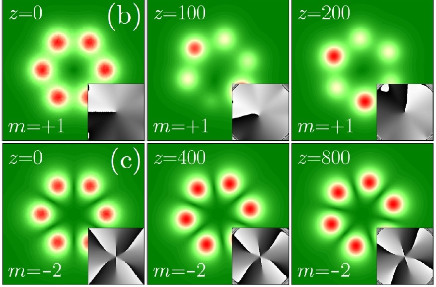 本工作的研究背景為,光場傳播會受到橫向折射率調(diào)制的強(qiáng)烈影響,這種現(xiàn)象為控制光場衍射、內(nèi)部結(jié)構(gòu)的多樣性以及人造材料中光束的傳播路徑開辟了重要途徑。在非線性情況下,這種折射率調(diào)制支持豐富的離散或晶格孤子。光渦旋是一種具有螺旋相位波前、帶有軌道角動量、能夠攜帶不同拓?fù)浜蓴?shù)的光束。攜帶不同拓?fù)浜蓴?shù)光渦旋的相互正交性可用于模分復(fù)用,極大地提高光纖通信系統(tǒng)的容量,還可用于光計(jì)算、光捕獲等。光渦旋也可以存在于以離散角旋轉(zhuǎn)對稱而非橫向周期性為特征的結(jié)構(gòu)中。對這些結(jié)構(gòu)的分析揭示了一個(gè)令人驚訝的事實(shí),即晶格對稱性嚴(yán)格限制對稱渦旋孤子的拓?fù)浜?,并決定它們的穩(wěn)定性。人們已經(jīng)發(fā)展了一種角度偽動量理論來解釋基于這種結(jié)構(gòu)的渦旋模特性。