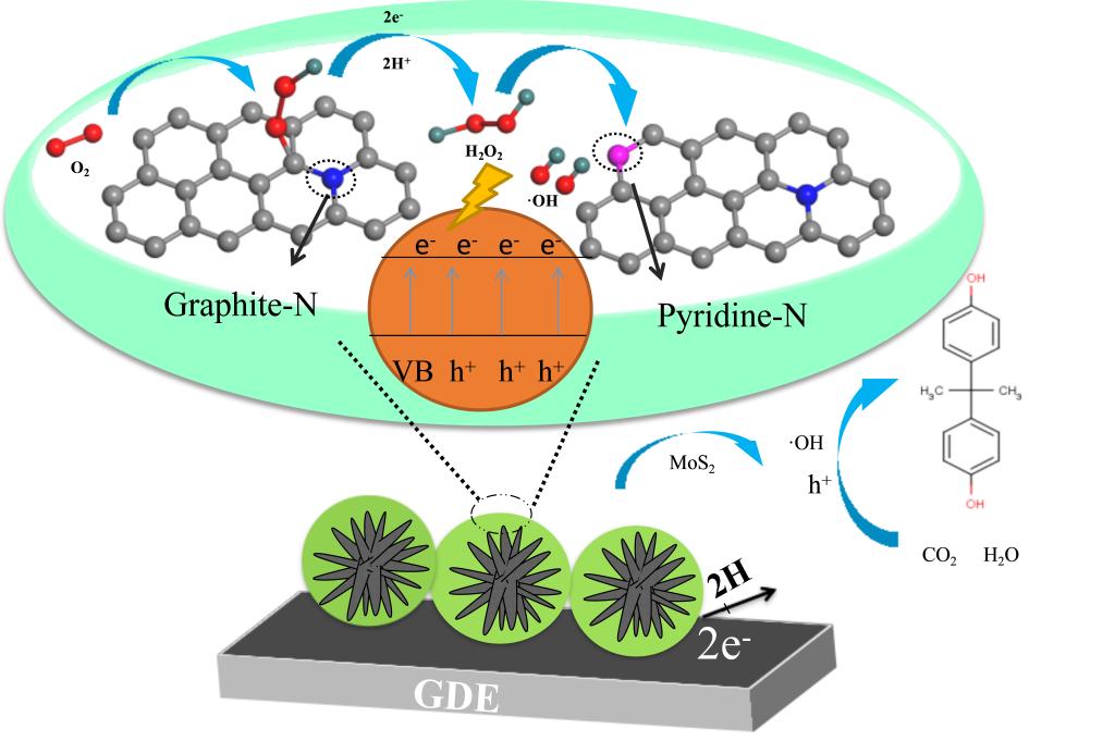 團(tuán)隊(duì)研究開發(fā)了一種新型光電催化氮摻雜氣體擴(kuò)散電極,通過光生電子提高電催化降解有機(jī)污染物的效率,其中電子與空穴及助催化劑相互協(xié)助高效合成過氧化氫,進(jìn)一步產(chǎn)生高活性集團(tuán)分子促進(jìn)有機(jī)物的降解去除,為光電催化電極的實(shí)際應(yīng)用提供理論支持。通過電沉積苯胺制備選擇性吸附降解雙功能電催化電極材料,構(gòu)建高效電化學(xué)體系,提高了氧氣反應(yīng)活性及其產(chǎn)物的選擇性,對(duì)全氟類持久性有機(jī)污染物降解性能優(yōu)化,電化學(xué)技術(shù)降解全氟化合物提供理論指導(dǎo)。