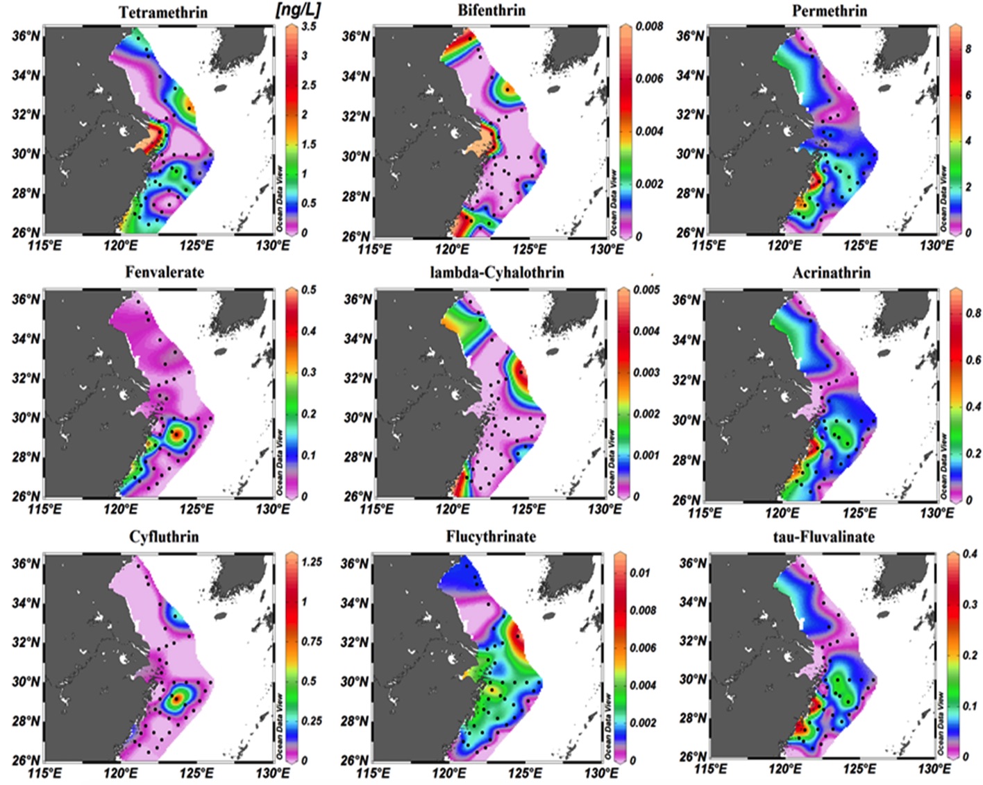 表層海水中九種擬除蟲菊酯化合物的空間分布