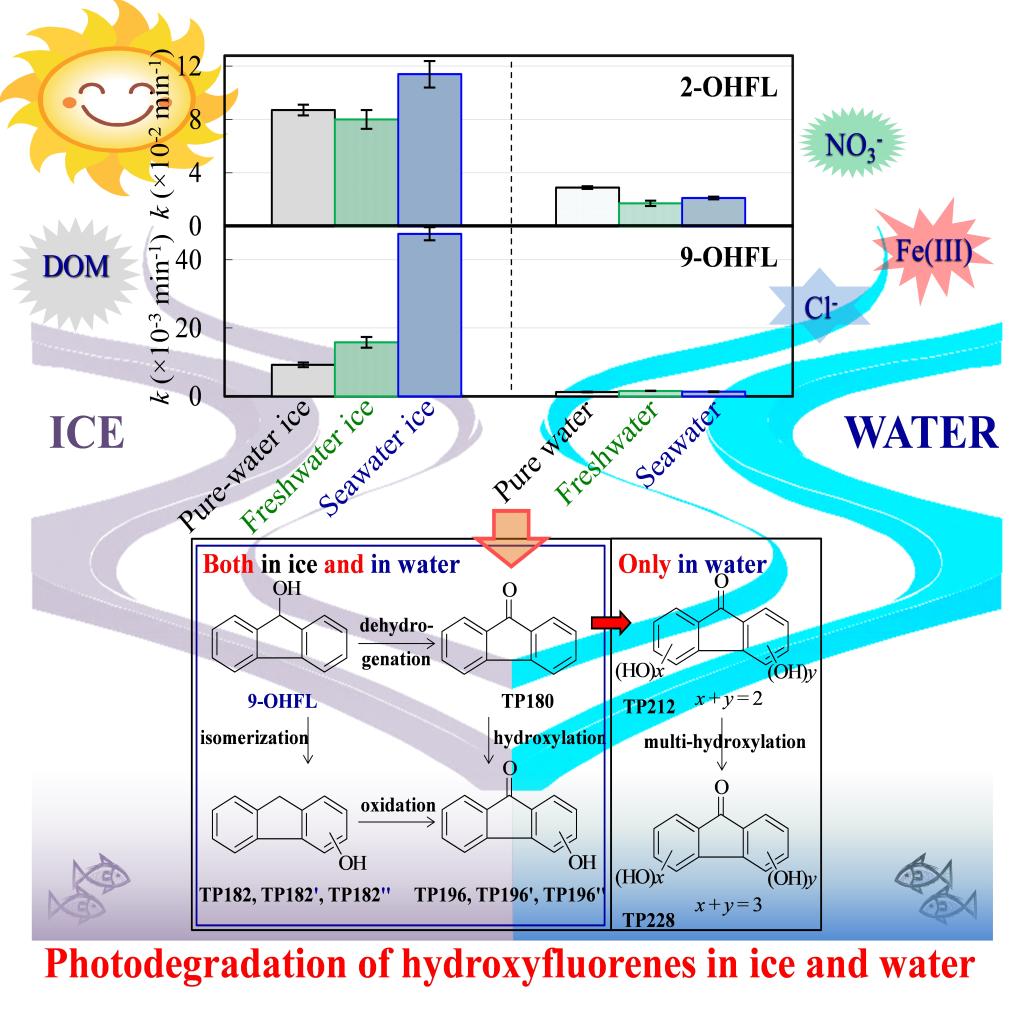 團(tuán)隊(duì)葛林科教授比較研究了新污染物羥基多環(huán)芳烴OH-PAHs在冰中和水中光化學(xué)轉(zhuǎn)化的動(dòng)力學(xué)、主要溶解性物質(zhì)的影響,以及轉(zhuǎn)化產(chǎn)物和路徑,揭示了冰雪環(huán)境光化學(xué)和水環(huán)境光化學(xué)的異同,這對(duì)于準(zhǔn)確評(píng)價(jià)寒冷環(huán)境中此類新型污染物的歸趨具有重要意義。