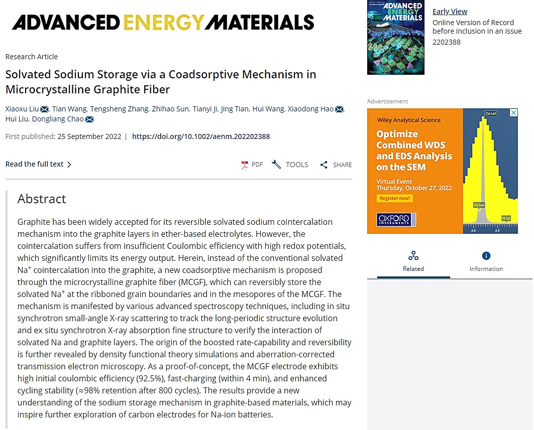 [2]Liu X*, Wang T, Zhang T, Sun Z, Ji T*, Tian J, et al. Solvated Sodium Storage via a Coadsorptive Mechanism in Microcrystalline Graphite Fiber. Adv Energy Mater. 2022:2202388.(IF=29.6)