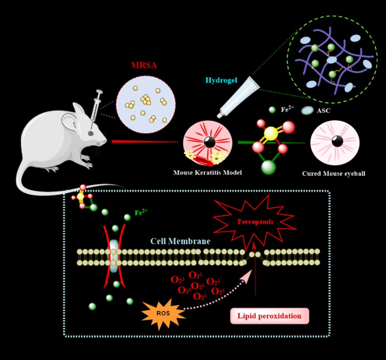 研究簡介:使用抗生素是當下治療細菌性角膜炎的主要手段。然而,頻繁出現(xiàn)的耐藥菌,特別是耐甲氧西林金黃色葡萄球菌(MRSA)等“超級細菌”,對目前依賴抗生素的治療體系提出嚴峻挑戰(zhàn),亟需研發(fā)新型抗菌策略。受哺乳動物鐵死亡啟發(fā),本研究探索并采用了直接鐵暴露的方式誘導細菌發(fā)生鐵死亡。結果發(fā)現(xiàn)被經常作為食品級補鐵劑的硫酸亞鐵能夠高效殺死金黃色葡萄菌,并引發(fā)其產生鐵死亡的典型特征。此外,硫酸亞鐵還能有效地殺死存留細胞(persister)和超級耐藥菌MRSA,并清除金黃色葡萄球菌的生物被膜。為了促進硫酸亞鐵在醫(yī)療領域中的應用,本研究利用透明質酸和抗壞血酸鹽制備了負載硫酸亞鐵的水凝膠。該水凝膠具有可注射、自愈合、高效殺滅MRSA,以及很好的生物相容性等特點。進一步通過構建由MRSA感染導致的小鼠角膜炎模型,我們發(fā)現(xiàn)該硫酸亞鐵水凝膠能夠促進小鼠角膜炎的快速恢復,并有效防止MRSA向肺部的擴散以及緩解小鼠的全身炎癥。這些結果揭示了硫酸亞鐵水凝膠替代抗生素依賴性材料來治療MRSA感染的應用前景,為當前抗生素危機下人類角膜炎的臨床治療提供了新的策略。相關產品已經申報了國家發(fā)明專利。
