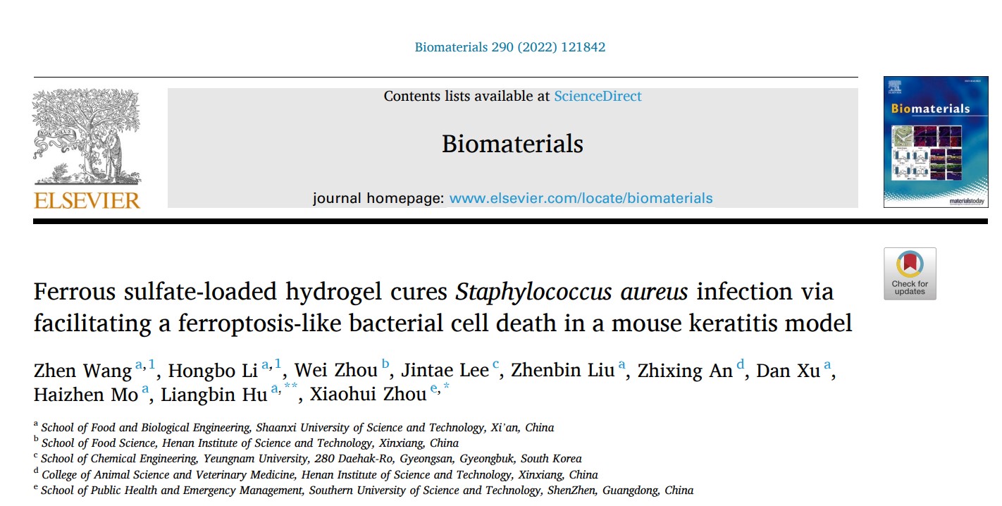 近日,我校食品科學與工程學院胡梁斌、莫海珍教授團隊在國際生物材料領域頂級期刊《Biomaterials》(IF=15.304)在線發(fā)表了題為“Ferrous sulfate-loaded hydrogel cures Staphylococcus aureus infection via facilitating a ferroptosis-like bacterial cell death in a mouse keratitis model”的研究論文。我校胡梁斌教授為第一通訊作者,陜西科技大學為第一作者和第一通訊作者單位。該研究涉及食品科學、微生物學與醫(yī)學交互領域,揭示了食品級補鐵劑硫酸亞鐵誘導金黃色葡萄球菌鐵死亡、清除存留細胞(persister)、殺死超級耐藥菌MRSA的生物活性;并通過透明質酸水凝膠作為硫酸亞鐵載體治愈了由MRSA感染導致的小鼠角膜炎,為當前抗生素危機下人類角膜炎的臨床治療提供了新的策略。該論文的發(fā)表極大地提高了我校在微生物鐵死亡領域的國際影響力。