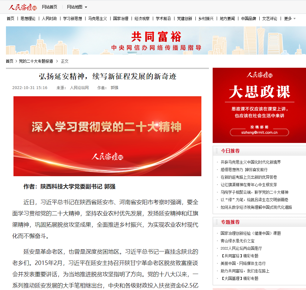 近日,人民論壇網(wǎng)“黨的二十大專題報(bào)道”刊發(fā)我校黨委副書記郭強(qiáng)的理論文章《弘揚(yáng)延安精神,續(xù)寫新征程發(fā)展的新奇跡》。