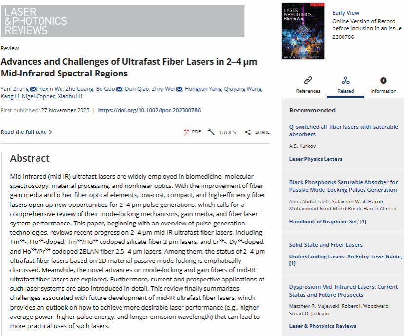 11月27日,我校物理與信息科學(xué)學(xué)院物理學(xué)科張亞妮教授聯(lián)合美國(guó)佐治亞理工大學(xué)廣哲博士、英國(guó)卡迪夫大學(xué)喬敦博士撰寫的題目為 “Advances and Challenges of Ultrafast Fiber Lasers in 2~4 μm Mid-Infrared Spectral Regions” 的論文在國(guó)際高水平期刊《Laser Photonics Reviews》發(fā)表。張亞妮教授為論文第一作者和通訊作者,我校物理學(xué)2023屆碩士武柯欣為共同第一作者,陜西科技大學(xué)為唯一通訊單位,哈爾濱工程大學(xué)郭波教授和中國(guó)科學(xué)院物理研究所魏志義研究員為共同通訊作者。