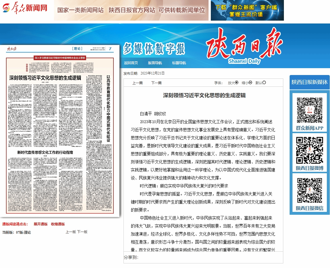 近日,《陜西日報》刊發(fā)我校馬克思主義學(xué)院白清平教授理論文章《深刻領(lǐng)悟習(xí)近平文化思想的生成邏輯》。