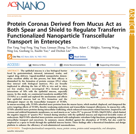 近日,我校食品科學(xué)與工程學(xué)院(生物與醫(yī)藥學(xué)院)食品營(yíng)養(yǎng)與健康團(tuán)隊(duì)在食品功能因子靶向納米遞送領(lǐng)域取得重要進(jìn)展,相關(guān)研究成果以“Protein coronas derived from mucus act as both spear and shield to regulate transferrin functionalized nanoparticle transcellular transport in enterocytes”為題,發(fā)表在國(guó)際知名頂級(jí)期刊ACS Nano(影響因子17.1)上。我校食品學(xué)院楊丹副教授為第一作者,姚曉琳教授為第一通訊作者,陜西科技大學(xué)為第一通訊單位。該項(xiàng)成果的發(fā)表提高了我校在食品功能因子靶向遞送領(lǐng)域的國(guó)際影響力。