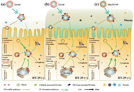 研究發(fā)現(xiàn),胃腸黏液層會(huì)削弱轉(zhuǎn)鐵蛋白修飾的主動(dòng)靶向納米載體(Tf-NP)在腸細(xì)胞的攝取及跨膜轉(zhuǎn)運(yùn)效率。在黏液分泌細(xì)胞中,Tf-NP表面形成的PCs掩蓋、抑制了Tf-NP的靶向作用。在無(wú)黏液細(xì)胞中,Tf-NP主要吸附大量與細(xì)胞骨架、囊泡等轉(zhuǎn)運(yùn)相關(guān)以及Tf特異性相關(guān)的蛋白,這些蛋白使納米載體的轉(zhuǎn)運(yùn)功能增強(qiáng),吸收效率提升?;诖?,團(tuán)隊(duì)利用黏液層中主要成分粘蛋白(mucin)預(yù)先包被Tf-NP形成“主動(dòng)PCs”以克服“被動(dòng)PCs”造成的困境,發(fā)現(xiàn)粘蛋白預(yù)包被納米載體(M@Tf-NP)顯著提高了Tf-NP的攝取及跨膜轉(zhuǎn)運(yùn)效率。這是因?yàn)椤爸鲃?dòng)PCs”的存在削弱了“被動(dòng)PCs”的形成能力;此外,基于mucin的糖蛋白及頂側(cè)分布特性,M@Tf-NP吸附了大量與內(nèi)質(zhì)網(wǎng)-高爾基體相關(guān)的轉(zhuǎn)運(yùn)蛋白,胞吐作用增強(qiáng)。由此可知,胃腸黏液通過“被動(dòng)PCs”的形成阻滯了主動(dòng)靶向納米載體的吸收,但也可基于“主動(dòng)PCs”策略來(lái)提高遞送效率。該研究詮釋了“以子之矛-攻子之盾”的科學(xué)現(xiàn)象,相關(guān)結(jié)果將為食品功能因子高效遞送體系構(gòu)建提供理論基礎(chǔ)和技術(shù)啟示。