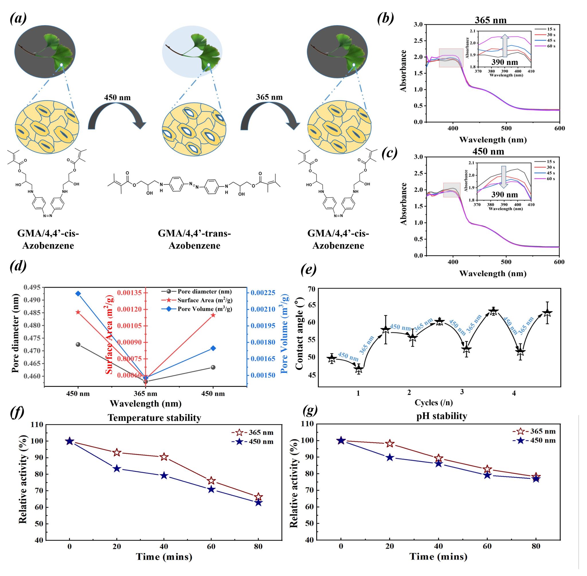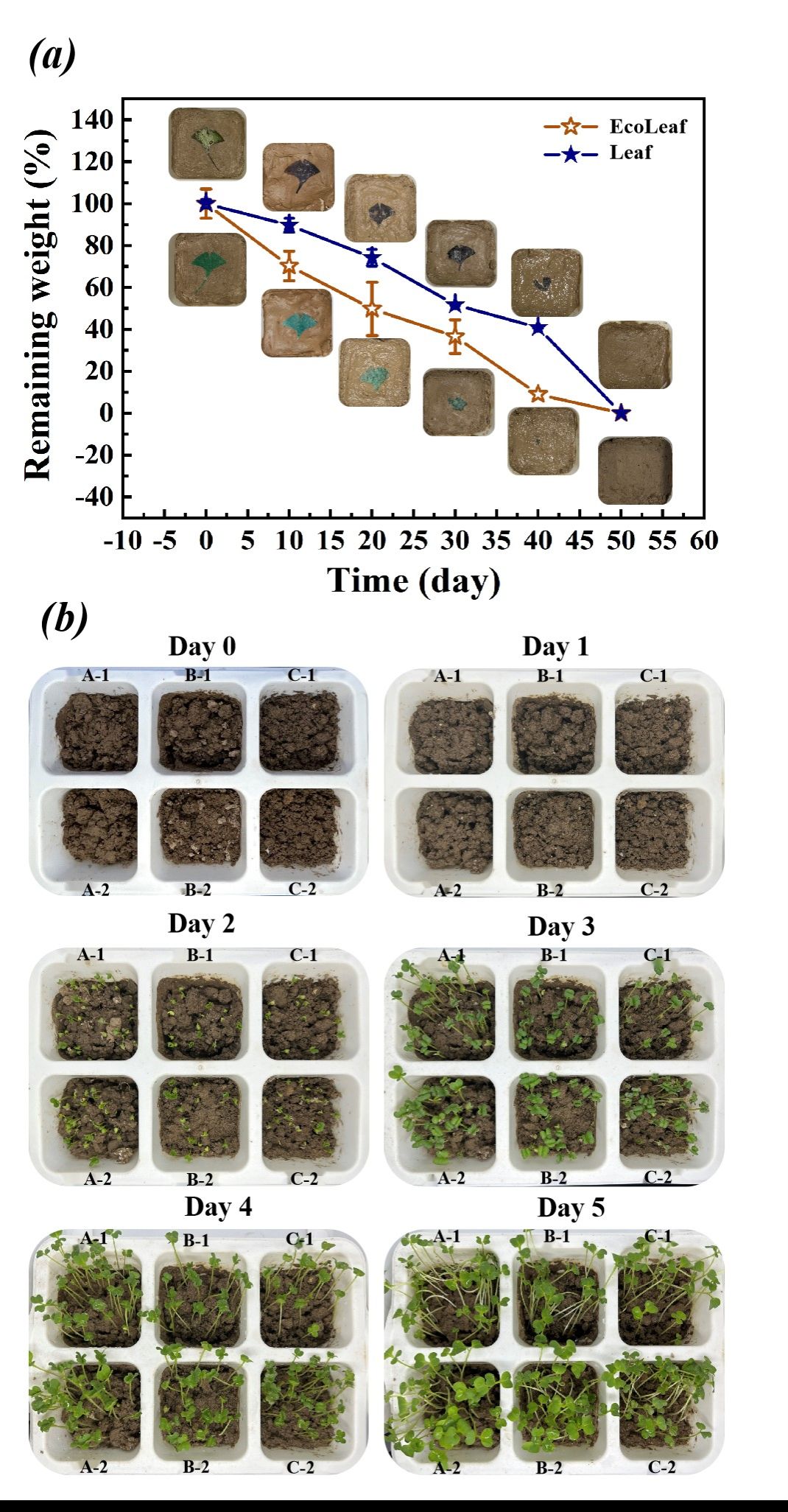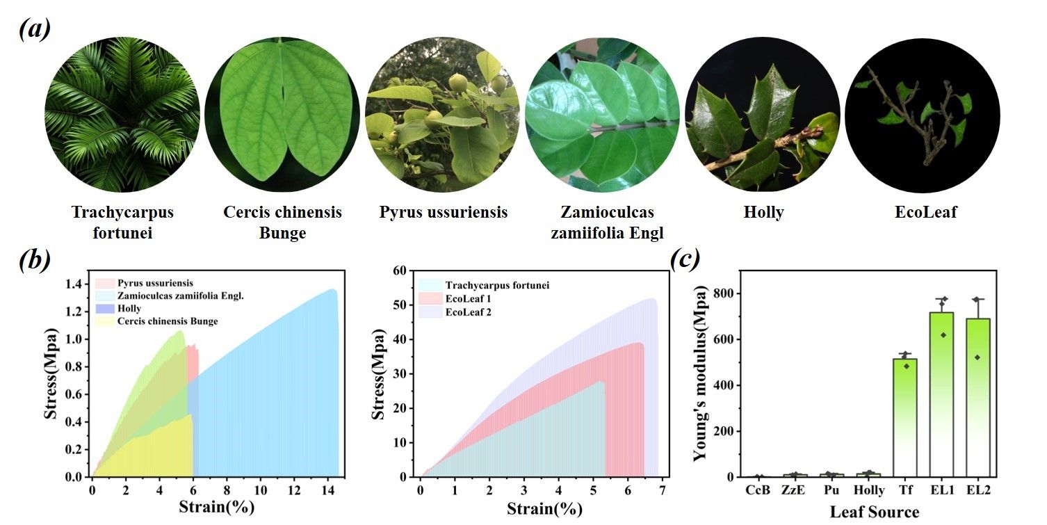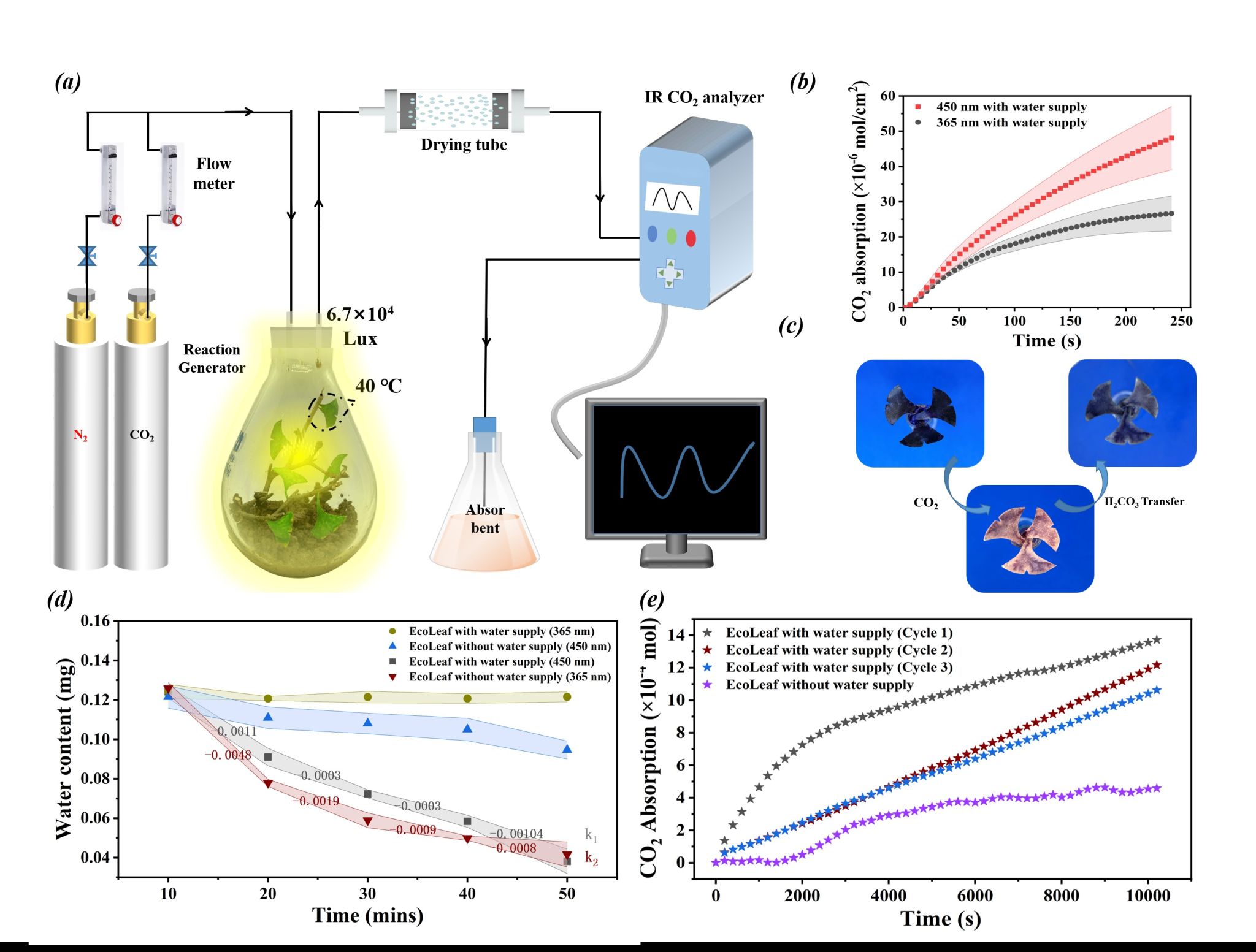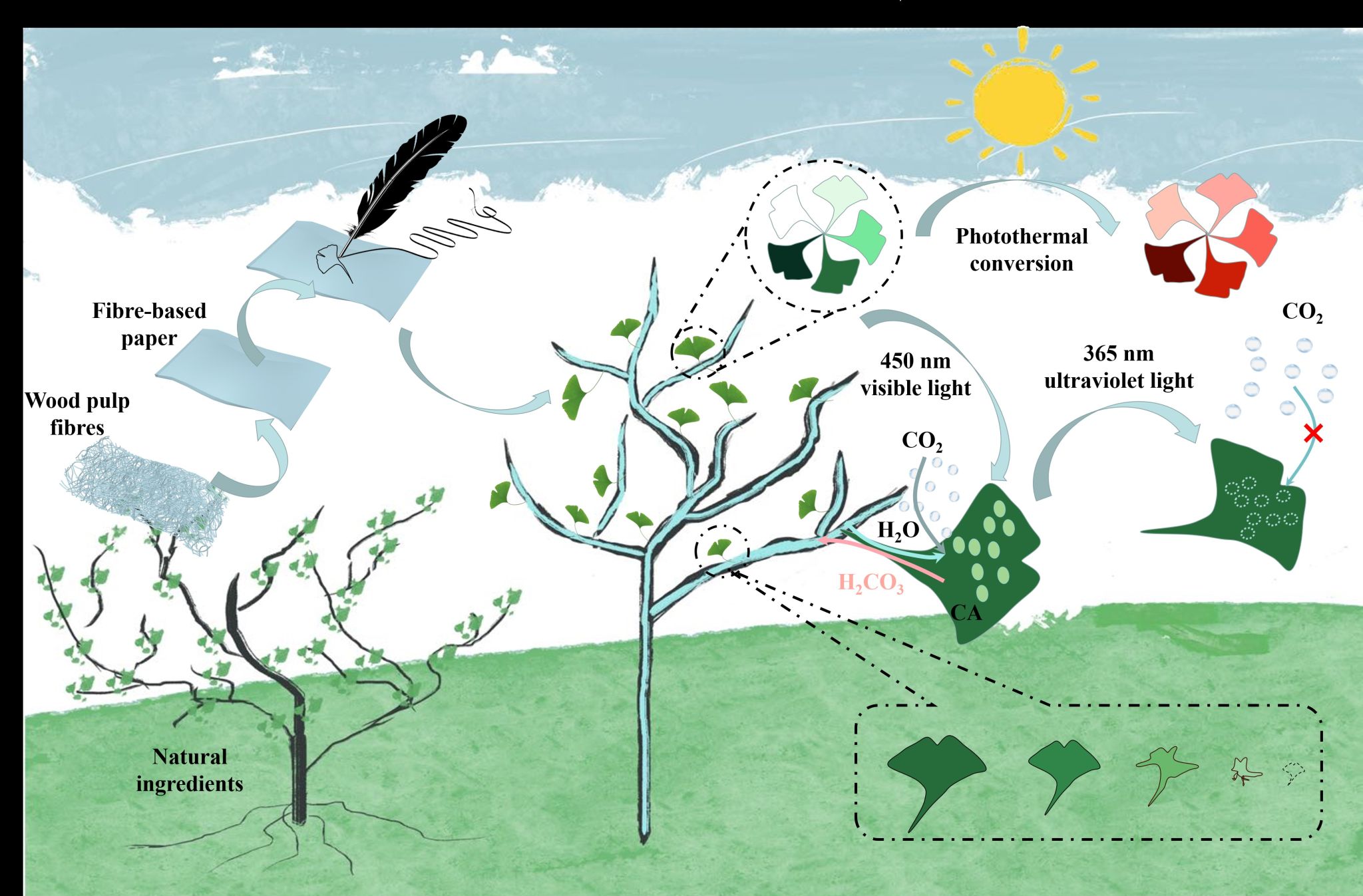 開(kāi)發(fā)人工樹(shù)葉處理環(huán)境超載的CO2對(duì)于碳中和意義重大。近期,陜西科技大學(xué)輕工學(xué)院生物質(zhì)與功能材料研究所(王學(xué)川教授團(tuán)隊(duì))與纖維新材料及廢棄物資源化利用團(tuán)隊(duì)(張素風(fēng)教授團(tuán)隊(duì))成員合作,制備了一種迄今為止最接近自然葉片的EcoLeaf。具體而言,該葉片以紙為基材,利用活性自由基聚合技術(shù)在其表面接枝構(gòu)筑光響應(yīng)聚合物涂層,與此同時(shí)將光合作用的關(guān)鍵固碳酶—碳酸酐酶原位包埋在其中(圖1)。在可見(jiàn)光照射下,光響應(yīng)性交聯(lián)涂層結(jié)構(gòu)發(fā)生變化,從而實(shí)現(xiàn)交聯(lián)網(wǎng)孔(仿葉片氣孔)的可控開(kāi)合,進(jìn)而實(shí)現(xiàn)載酶葉片對(duì)空氣中CO2固碳速率的調(diào)節(jié)(圖2-圖3)。此外,該Ecoleaf具有與天然葉片相似的機(jī)械性能(圖4),并可順利地參與生態(tài)系統(tǒng)降解與養(yǎng)分循環(huán)過(guò)程,實(shí)現(xiàn)“化作春泥更護(hù)花”的美好理想(圖5)。Ecoleaf中的固碳途徑具有較為靈活的可設(shè)計(jì)性,未來(lái)可為其它生物固碳途徑提供仿生的多功能平臺(tái)。該工作以“Arti?cial cellulosic leaf with adjustable enzymatic CO2 sequestration capability”為題發(fā)表在《Nature Communications》上(Nat Commun, 2024, 15(1): 4898)。陜西科技大學(xué)是本論文的唯一通訊單位,輕工學(xué)院碩士生杜晨曦為該論文的第一作者,朱興副教授與賀斌博士為該論文的共同通訊作者。該研究得到國(guó)家自然科學(xué)基金委、陜西省重點(diǎn)研發(fā)計(jì)劃、陜西省教育廳重點(diǎn)項(xiàng)目的支持。