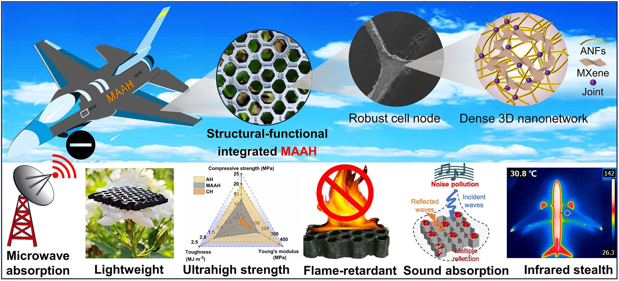 團隊開發(fā)了一種納米雜化組裝策略制備了可擴展、可回收、無樹脂的結(jié)構(gòu)功能一體化的芳綸蜂窩吸波(MAAH)材料。得益于芳綸納米纖維相互交織形成的一體化超強蜂窩節(jié)點設(shè)計以及致密的三維網(wǎng)絡(luò)結(jié)構(gòu),蜂窩的抗壓強度和韌性分別是商用芳綸蜂窩的6倍和25倍。更重要的是,MXene導(dǎo)電網(wǎng)絡(luò)與蜂窩的多孔結(jié)構(gòu)以及導(dǎo)電損耗、偶極和界面極化的協(xié)同作用使其具有優(yōu)異的吸波性能,在厚度僅為1.9 mm反射損耗最小值可以達(dá)到-38.5 dB,幾乎覆蓋了整個X波段。此外,MAAH還具有出色的紅外熱隱身、吸音性能和結(jié)構(gòu)完整性的實時監(jiān)測功能,在航空航天和軍事民用等領(lǐng)域具有廣闊的應(yīng)用前景。該研究“Functional-Structural Integrated Aramid Nanofiber?based Honeycomb Materials with Ultrahigh Strength and Multi?Functionalities”發(fā)表在《Advanced Fiber Materials》上。博士研究生孫浩為本文第一作者,楊斌副教授、張美云教授為通訊作者。