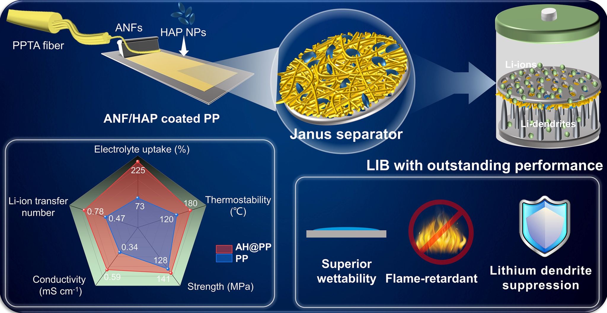 針對目前商業(yè)化的聚烯烴隔膜存在的熱穩(wěn)定性差、潤濕性低、易被鋰枝晶刺穿等問題,導(dǎo)致鋰電池易發(fā)生熱失控和短路等安全隱患問題,利用芳綸納米纖維和羥基磷灰石納米顆粒作為主要構(gòu)筑單元,在聚烯烴隔膜表面涂覆三維納米網(wǎng)絡(luò)保護層,制備了一種具有高強度、高模量、納米孔隙結(jié)構(gòu)的Janus隔膜(AH@PP)。復(fù)合隔膜具有優(yōu)異的熱穩(wěn)定性,保持著較高的鋰離子傳輸效率和電化學(xué)表現(xiàn)能力,同時,具有高模量和納米級孔隙結(jié)構(gòu)的涂層能夠有效抵御鋰枝晶的穿刺,在軟包電池中的成功應(yīng)用也證明了其應(yīng)用的普適性。該研究“Janus separator with high-temperature resistance and dendrite suppression for advanced Li-ions batteries”發(fā)表在Journal of Power Sources上。碩士研究生龐瑞雪是論文的主要完成人,楊斌副教授、張美云教授為通訊作者。
