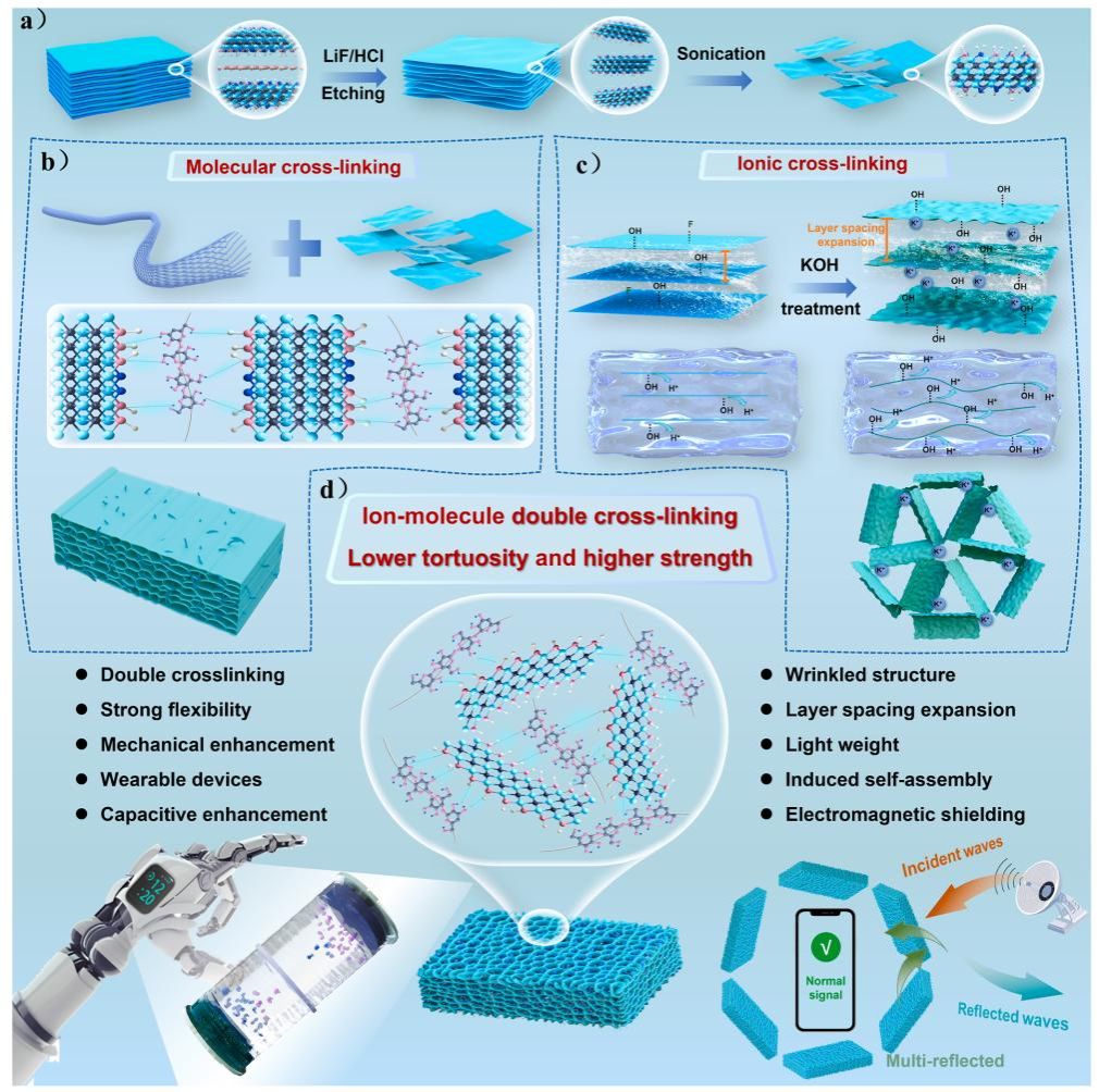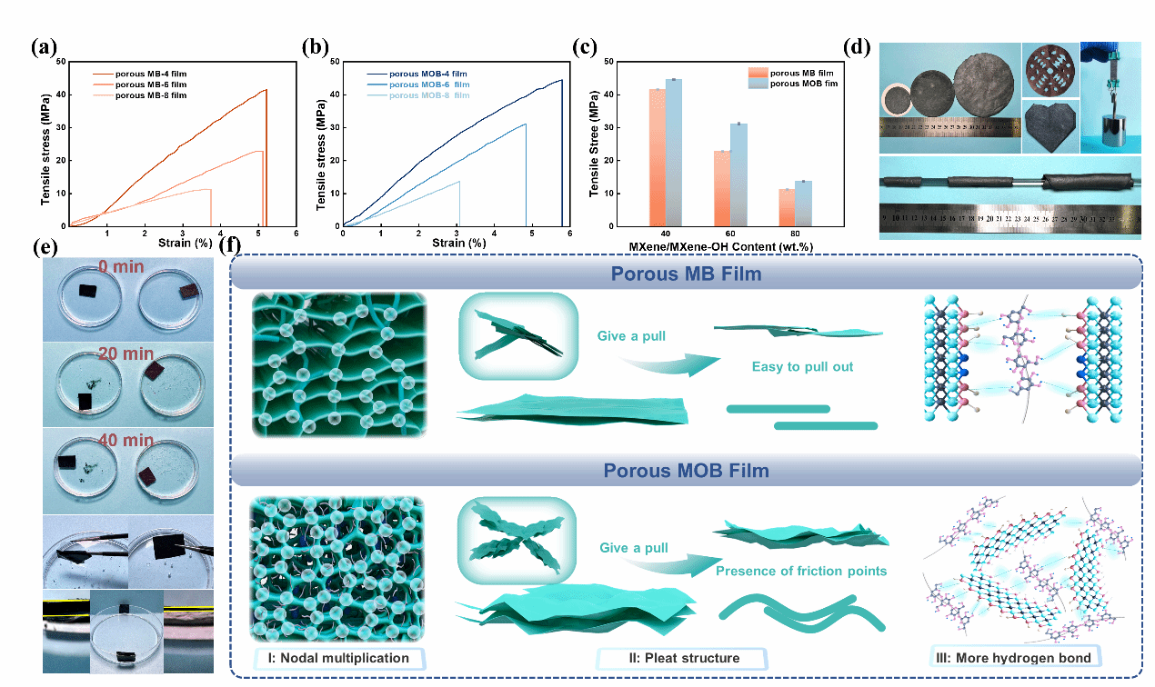 不同比例的分子交聯(lián)與離子分子雙交聯(lián)多孔MXene膜力學(xué)性能及力學(xué)提升機理圖