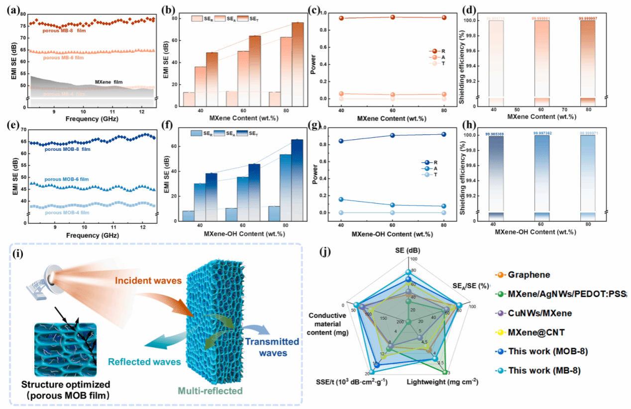 文章亮點如下:通過離子分子雙交聯(lián)體系和隨后的冷凍干燥工藝,構(gòu)筑了在橫向和垂直方向都具有三維網(wǎng)狀多孔的結(jié)構(gòu),這一獨特結(jié)構(gòu)極大縮短了離子的傳遞速率,纖維與納米片之間的高度互連性也提高了多孔膜的力學(xué)性能及電磁屏蔽性能;離子交聯(lián)通過庫侖吸引調(diào)整MXene片層的方向,同時優(yōu)化的終端和離子插層擴大了層間距;分子交聯(lián)通過氫鍵相互作用調(diào)整多孔結(jié)構(gòu)的骨架;具有互連性的多孔MXene-OH/BC膜同時表現(xiàn)出優(yōu)異電化學(xué)性能和電磁屏蔽性能,提供了527 F/g的電容,41.5 MPa的機械強度,分別為MXene薄膜的140%和367%,并表現(xiàn)出67.2 dB的電磁屏蔽效能。