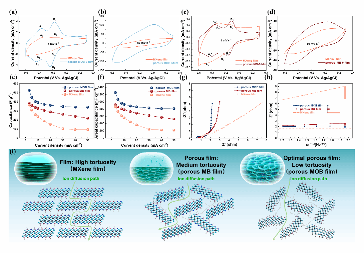 多孔MXene薄膜因其多樣的孔隙結(jié)構(gòu)和豐富的表面化學(xué)性質(zhì),成為理想的柔性電子材料,在柔性儲能、電磁屏蔽等應(yīng)用方面潛力巨大。然而,其典型的問題,特別是作為柔性儲能材料時,在高電流密度下,電容性能急劇下降。主要原因在于層間結(jié)合致密,阻礙了離子的動態(tài)擴散,此外,離子擴散路徑的曲率過高,電荷傳輸過程緩慢。目前研究者致力于研發(fā)兼具大比表面積、低曲率以及優(yōu)良導(dǎo)電性和機械性能的多孔MXene薄膜,但仍然面臨諸多挑戰(zhàn)。