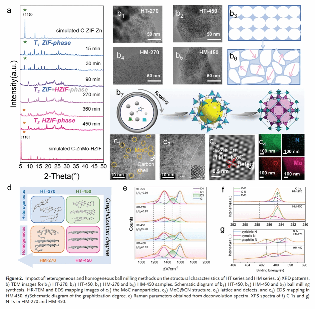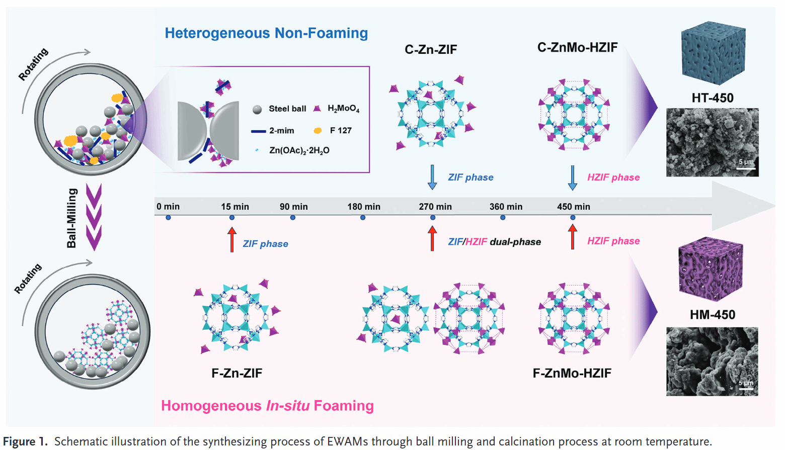 為了解決上述問題,陜西科技大學(xué)黃文歡教授團(tuán)隊(duì)開發(fā)出了一種簡便且可擴(kuò)展實(shí)施的策略,即利用ZnMo-HZIF材料,通過球磨發(fā)泡和高溫煅燒工藝,成功構(gòu)建出多氮摻雜的MoC/NC三維泡沫結(jié)構(gòu)復(fù)合材料。這項(xiàng)工作提出了關(guān)于結(jié)構(gòu)和組分對電磁波吸收性能協(xié)同效應(yīng)的新視角,并為制備輕質(zhì)高性能MOF基電磁波吸收材料提供了新方法。相關(guān)工作在《Advanced Functional Materials》期刊上以“In situ Mechanical Foaming of Hierarchical Porous MoC for Assembling Ultra-light, Self-cleaning, Heat-insulation, Flame-retardant, and Infrared-stealth Device”為題發(fā)表。