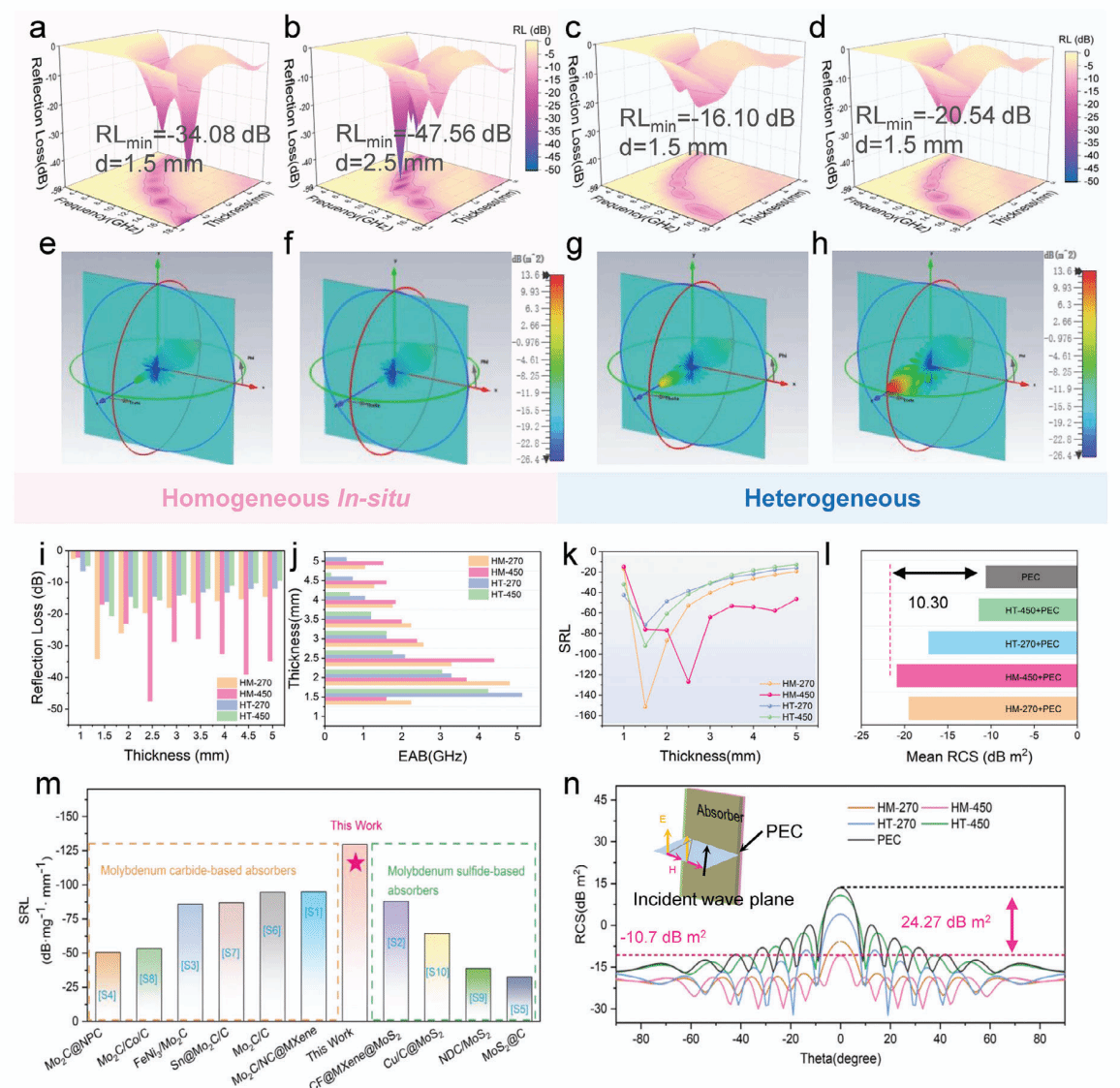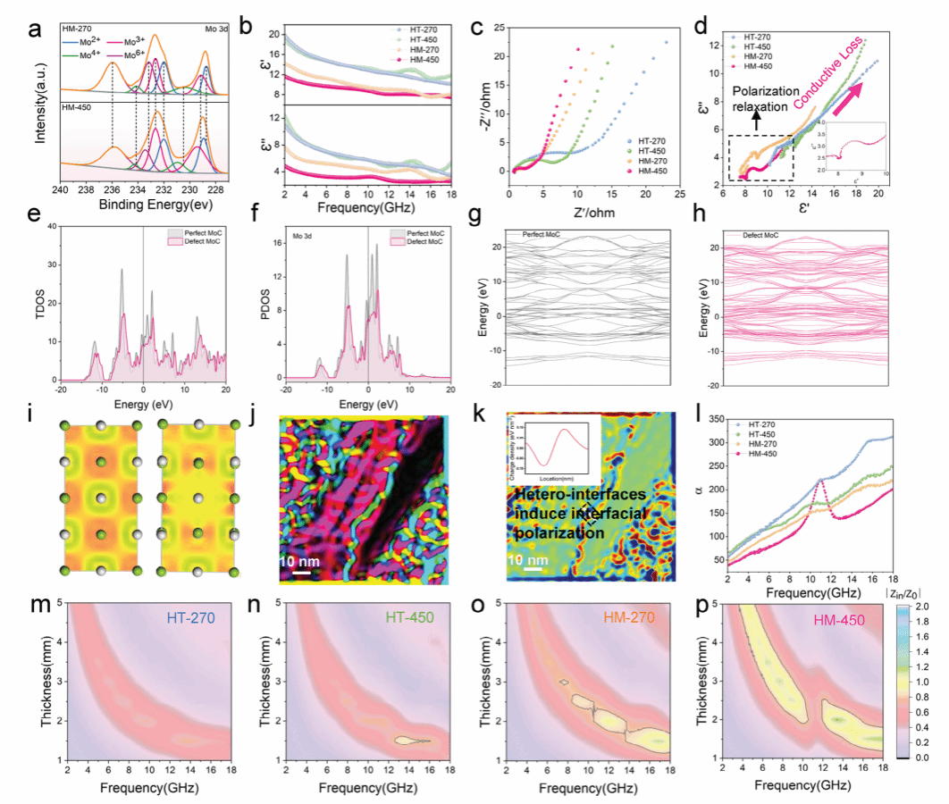 文章亮點(diǎn)包括:通過機(jī)械球磨的方法制備出泡沫結(jié)構(gòu),為材料內(nèi)部帶來了顯著的孔隙,這種泡沫結(jié)構(gòu)使得入射電磁波能夠發(fā)生多次反射,為波的傳播提供了眾多路徑;高度石墨化可以誘發(fā)高效的電子遷移和跳躍,加速電導(dǎo)率的損失和電磁波的吸收。在外加電磁場的作用下,MoC/NC異質(zhì)界面中存在的大量氮原子會(huì)導(dǎo)致更多的界面/偶極子極化;碳基質(zhì)中的鉬缺陷會(huì)破壞電荷分布平衡,促進(jìn)偶極子極化和電磁波能量的耗散。因此,優(yōu)異的電磁吸收性能來源于泡沫多級孔結(jié)構(gòu)、多個(gè)異質(zhì)界面、鉬缺陷及大量摻雜原子之間的協(xié)同效應(yīng);設(shè)計(jì)出的裝置經(jīng)過簡單的浸漬和高溫還原過程后,表現(xiàn)出優(yōu)異的疏水性、阻燃性和紅外隱身特性。