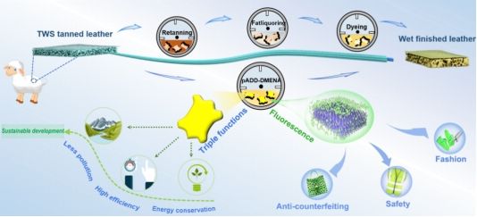 6. 團(tuán)隊(duì)設(shè)計(jì)合成多功能熒光兩性聚合物(簡稱pADD-DMENA),開發(fā)了生態(tài)有機(jī)無鉻皮革制造的顛覆性“三位一體”策略。pADD-DMENA表現(xiàn)出優(yōu)異的復(fù)鞣、加脂和染色性能,柔軟度為8.5 mm,增厚率為40%,抗張強(qiáng)度為19.77 MPa,撕裂強(qiáng)度為59.40 N/mm。且與傳統(tǒng)陰離子染色皮革相比,pADD-DMENA染色皮革表面呈現(xiàn)均勻的亮黃色,并且具有優(yōu)異的耐光性、耐久性和耐洗性。此外,其熒光本體能夠?qū)ε鞲锖臀鬯械膒ADD-DMENA進(jìn)行視覺跟蹤,從而可以實(shí)時(shí)監(jiān)測(cè)pADD-DMENA的精確分布。綜上所述,pADD-DMENA的開發(fā)可以一步完成傳統(tǒng)的濕整理工藝,有效節(jié)省工藝時(shí)間,減少各種化學(xué)品的添加11.2%,并表現(xiàn)出更好的廢水降解性(BOD5/COD為0.35)。這一創(chuàng)新策略為生態(tài)皮革制造向低能耗、少污染的綠色方向拓寬了道路。相關(guān)成果發(fā)表在Green Chemistry(DOI: 10.1039/D3GC01446K)上。陜西科技大學(xué)博士研究生魏超為本論文的第一作者,通訊作者為陜西科技大學(xué)輕工科學(xué)與工程學(xué)院王學(xué)川教授和劉新華副教授。
