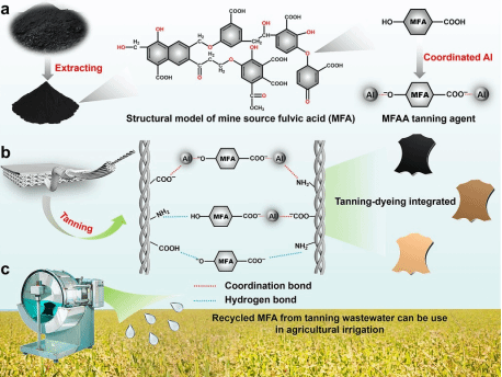 7. 團(tuán)隊(duì)強(qiáng)濤濤教授成功開發(fā)了一種生態(tài)復(fù)鞣劑,該劑利用皮革固體廢料,將含鉻皮革屑水解為低分子量的明膠多肽,并與金屬離子(如Zr4+和Al3+)形成復(fù)鞣劑。該復(fù)鞣劑能夠與膠原纖維形成多點(diǎn)交聯(lián),從而顯著提升復(fù)鞣皮革的機(jī)械性能,并有效去除游離甲醛。此外,金屬離子的參與還增強(qiáng)了皮革對(duì)染料和加脂劑的吸收能力,減少了醛鞣皮革的潛在危害與廢水排放,對(duì)清潔后鞣制過程具有重要意義。強(qiáng)濤濤教授還研發(fā)了一種可按需調(diào)節(jié)和廢水回收的黃腐酸基無鉻鞣劑,成功實(shí)現(xiàn)了鞣染一體化的創(chuàng)新策略。該新型無鉻鞣劑(MFAA)是基于風(fēng)化煤提取的腐殖酸與鋁離子的結(jié)合,能夠與皮革膠原纖維形成穩(wěn)定的交聯(lián)效果,并具備原位染色能力。同時(shí),該方法還能夠提取鞣制廢水中的殘留鋁,回收的腐殖酸可作為水稻種子的發(fā)芽劑。這一新型鞣染一體化方法為皮革行業(yè)的可持續(xù)發(fā)展提供了新的解決方案,標(biāo)志著無鉻鞣劑研究的又一重要里程碑。相關(guān)成果已發(fā)表在Chemical Engineering Journal, 2024, 482, 148892;International Journal of Biological Macromolecules, 2024, 261, 129922。