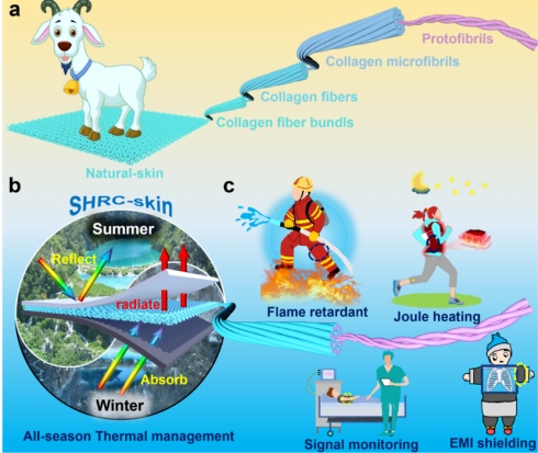 5. 團(tuán)隊(duì)報(bào)道了一種用于全季節(jié)可穿戴熱管理的具有三明治結(jié)構(gòu)的多功能 Janus天然皮膚。這種Janus型天然皮膚在無需額外能量輸入的情況下便可在冷卻和加熱模式之間自由轉(zhuǎn)換。此外,優(yōu)異的非對(duì)稱潤濕性、阻燃性、導(dǎo)電性、焦耳加熱、電磁屏蔽干擾和生理信號(hào)監(jiān)測(cè)等多種附屬功能也極大程度增加了其對(duì)復(fù)雜環(huán)境的適應(yīng)性。在全季節(jié)可穿戴熱管理、低碳出行和節(jié)能建筑家具領(lǐng)域表現(xiàn)出廣闊的應(yīng)用潛力及前景。相關(guān)成果發(fā)表在Composites Part B(DOI: 10.1016/j.compositesb.2024.111573)上。陜西科技大學(xué)博士生謝龍為本論文的第一作者。通訊作者為陜西科技大學(xué)王學(xué)川教授、劉新華副教授、岳歐陽博士后。