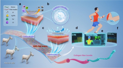 3. 團(tuán)隊(duì)采用簡單的一鍋法,以天然皮膚為基材,并引入甜菜堿、銀納米粒子(AgNPs)、氯化鈉(NaCl)和甘油/水二元溶劑形成的混合液,以納米化方式設(shè)計(jì)了一種全新的多功能天然皮膚基有機(jī)水凝膠電子皮膚(NSD-Gel e-skin)。NSD-Gel e-skin顯示出良好的透明度以及優(yōu)異的拉伸強(qiáng)度(7.33 MPa)、抗穿刺性、保濕性、回濕性和抗菌性。此外,NSD-Gel e-skin具有優(yōu)異的耐寒/耐熱性和刺激反應(yīng)特性,可以有效地感知環(huán)境溫度或濕度的變化,以及監(jiān)測(cè)人體生理/運(yùn)動(dòng)信號(hào)。體外和體內(nèi)實(shí)驗(yàn)表明,NSD-Gel e-skin具有理想的生物相容性,即使在惡劣的環(huán)境中(-196℃至100℃)也能起到組織保護(hù)作用。NSD-Gel e-skin在可穿戴電子設(shè)備、人機(jī)界面和人工智能等領(lǐng)域具有巨大的應(yīng)用潛力,為開發(fā)具有按需特性的高性能電子皮膚提供了一個(gè)重要平臺(tái)。相關(guān)成果發(fā)表在Advanced Functional Materials(DOI: 10.1002/adfm.202212856)上。通訊作者為陜西科技大學(xué)王學(xué)川教授和劉新華副教授以及四川大學(xué)郭俊凌教授,博士研究生白忠薛為本論文的第一作者。
