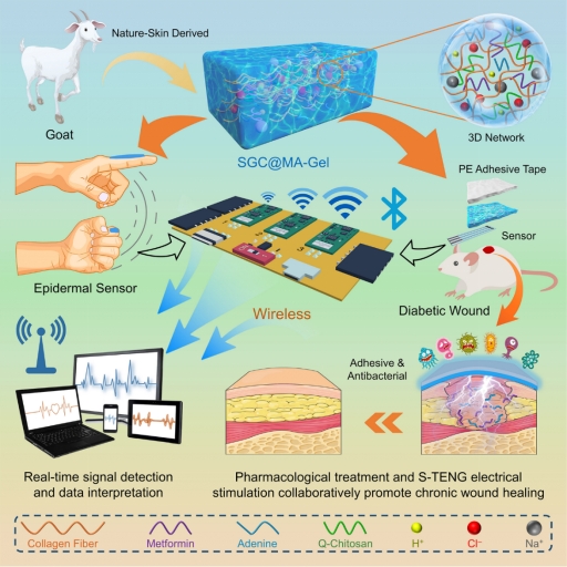 4. 團(tuán)隊(duì)利用天然皮膚基有機(jī)水凝膠制備了一種單電極摩擦納米發(fā)電機(jī),進(jìn)而開發(fā)出可用于慢性傷口治療的智能生物電子系統(tǒng)。該系統(tǒng)具有生物可吸收性、自供電和無線傳輸功能,可進(jìn)行持續(xù)性按需藥物治療、納米發(fā)電機(jī)自驅(qū)動(dòng)的傷口電刺激和可視化的實(shí)時(shí)傷口狀況評(píng)估。其中,天然皮膚衍生的有機(jī)水凝膠(SGC@MA-Gel)采用簡單的一鍋法制備,主要由天然皮膚、甘油、季銨化殼聚糖、二甲雙胍和腺嘌呤組成。SGC@MA-Gel擁有天然皮膚的層級(jí)結(jié)構(gòu)和生物特性,具有膠原蛋白基生物材料的高負(fù)載能力,還具備理想的機(jī)械強(qiáng)度、粘附性、導(dǎo)電性、抗菌性、按需藥物釋放和人體生理信號(hào)監(jiān)測(cè)功能。該生物電子系統(tǒng)不僅可提供直接的按需藥物治療和納米發(fā)電機(jī)驅(qū)動(dòng)的傷口電刺激,以促進(jìn)皮膚傷口快速恢復(fù);還能夠?qū)崟r(shí)檢測(cè)傷口處的葡萄糖、尿酸和pH等生物標(biāo)志物,用于傷口可視化診斷和評(píng)估。相關(guān)成果發(fā)表在Nano Energy上。第一作者為白忠薛博士,通訊作者為王學(xué)川教授、劉新華副教授和四川大學(xué)陳一寧博士。