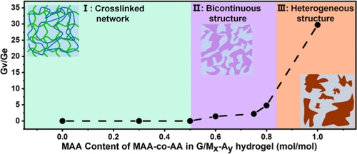 10. 團(tuán)隊(duì)張慧潔副教授等報(bào)道了通過氫鍵增強(qiáng)的明膠-丙烯酸共聚物水凝膠中的丙烯酸共聚物的甲基含量對(duì)水凝膠的結(jié)構(gòu)性能影響。研究表明,隨著甲基含量的增加,水凝膠的結(jié)構(gòu)逐漸由交聯(lián)的網(wǎng)絡(luò)結(jié)構(gòu)轉(zhuǎn)變?yōu)殡p連續(xù)相的相分離結(jié)構(gòu)以及多分散尺度的相分離結(jié)構(gòu)。含相同結(jié)構(gòu)的水凝膠具有相似的黏彈性行為。其中,含雙連續(xù)相的水凝膠具有最優(yōu)異的力學(xué)性能,其斷裂應(yīng)力可達(dá)近10 MPa,顯著高于其他已報(bào)道的明膠基水凝膠的力學(xué)強(qiáng)度。該成果發(fā)表在自然指數(shù)期刊Macromolecules, 2022, 55 (17), 7401-7410。