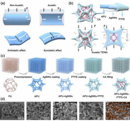 1. 制備基于負(fù)泊松比超材料的摩擦納米發(fā)電機(jī)(Auxetic-TENG),相比常用正泊松比材料可更高效吸收并轉(zhuǎn)化機(jī)械能為電能,具有更優(yōu)異的發(fā)電效率和檢測(cè)靈敏度。經(jīng)過測(cè)試,Auxtic -TENG的開路電壓與傳統(tǒng)的接觸分離TENG相比提高了4倍,功率密度達(dá)到4.2 W m?2。應(yīng)用實(shí)驗(yàn)表明在各種壓縮比和應(yīng)力條件下,Auxetic-TENG可以保持優(yōu)越的靈敏性和耐用性,突出其作為可穿戴自供電傳感器用于綜合醫(yī)療保健的潛力。相關(guān)成果發(fā)表在Advanced Energy Materials(DOI: https://doi.org/10.1002/aenm.202400212)上。通訊作者為陜西科技大學(xué)輕工科學(xué)與工程學(xué)院王學(xué)川教授和劉新華副教授, 岳歐陽為本論文的第一作者。