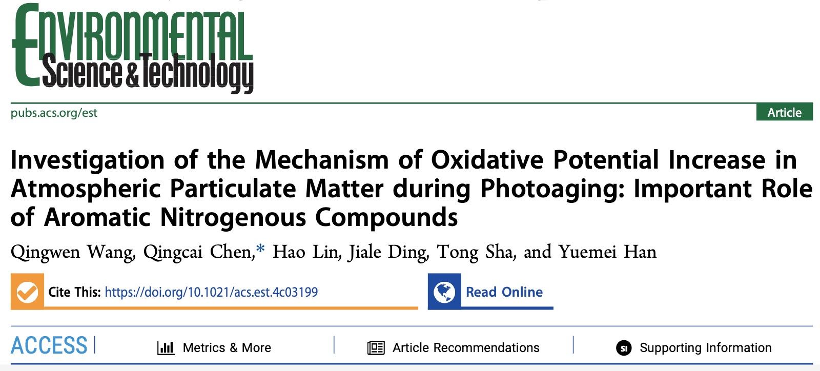 近日,環(huán)境學(xué)院陳慶彩教授團(tuán)隊(duì)關(guān)于大氣污染健康風(fēng)險(xiǎn)的研究成果,在大氣領(lǐng)域頂級(jí)期刊《Environmental Science & Technology》(中科院一區(qū)TOP,自然指數(shù)期刊)上發(fā)表,題目為“Investigation of the mechanism of oxidative potential increase in atmospheric particulate matter during photoaging: important role of aromatic nitrogenous compounds”。陳慶彩教授為唯一通訊作者,碩士研究生王擎雯為第一作者,陜西科技大學(xué)為第一單位和唯一通訊單位。
