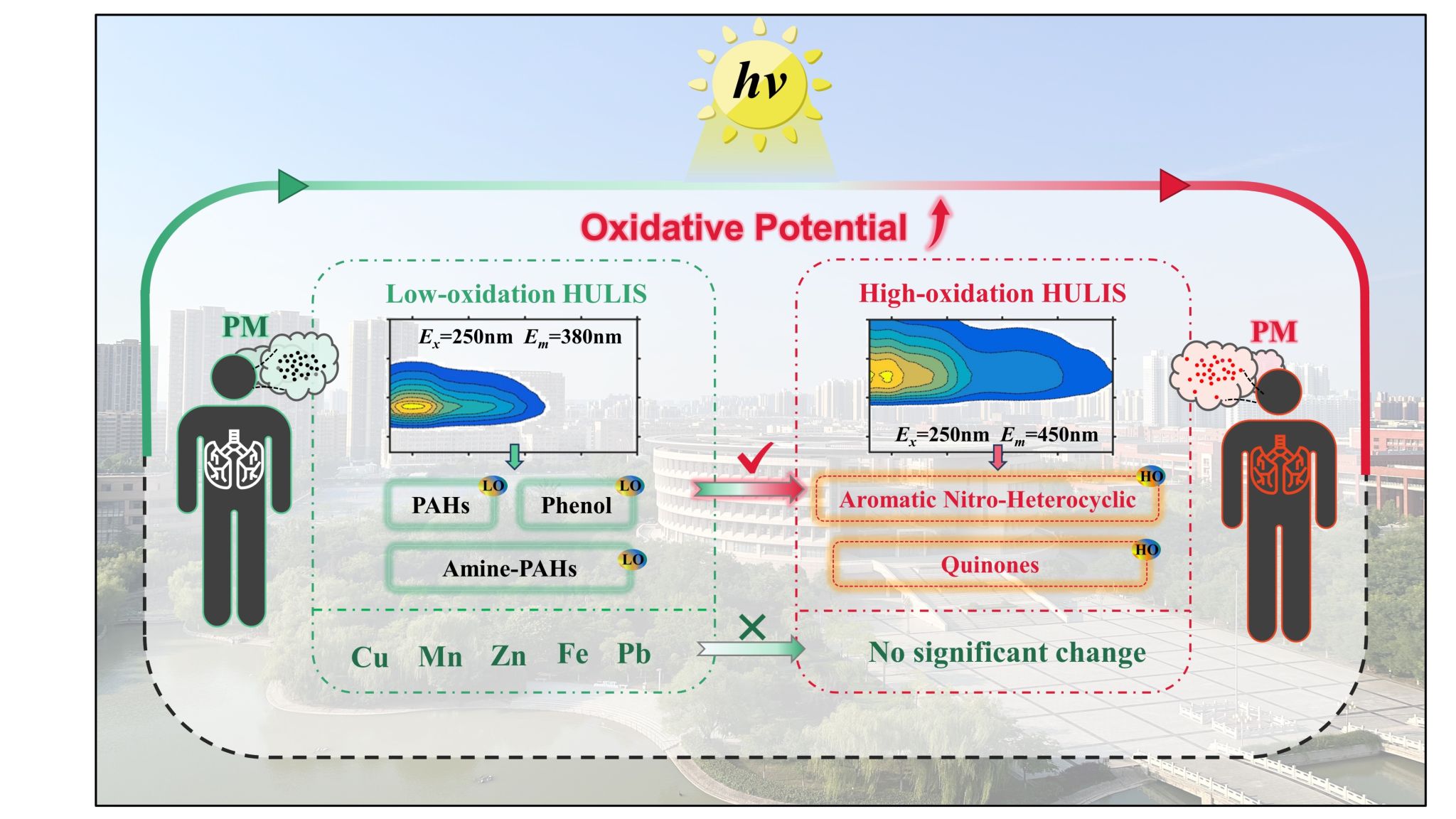 研究發(fā)現(xiàn)太陽光照可以使大氣顆粒物的氧化毒性顯著增強(qiáng),證實(shí)了自然因素對大氣顆粒物健康風(fēng)險(xiǎn)的影響事實(shí)。經(jīng)過化學(xué)分析和機(jī)制探討,發(fā)現(xiàn)大氣顆粒物毒性增加主要是由于光照引發(fā)二次有機(jī)毒性分子和持久性自由基的生成。其中,醌類分子是產(chǎn)生二次氧化毒性最主要原因,硝基酚類化合物和含氮雜環(huán)化合物發(fā)揮了催化作用,促進(jìn)了新的氧化毒性化合物生成和催化產(chǎn)生活性氧自由基的產(chǎn)生。這一發(fā)現(xiàn)揭示了太陽光照條件下大氣顆粒物毒性變化的關(guān)鍵驅(qū)動(dòng)因素和分子機(jī)制,不僅豐富了大氣顆粒物在實(shí)際環(huán)境中毒性變化的科學(xué)理論,還為應(yīng)對環(huán)境污染與健康風(fēng)險(xiǎn)提供了新的認(rèn)知和方法指導(dǎo)。
