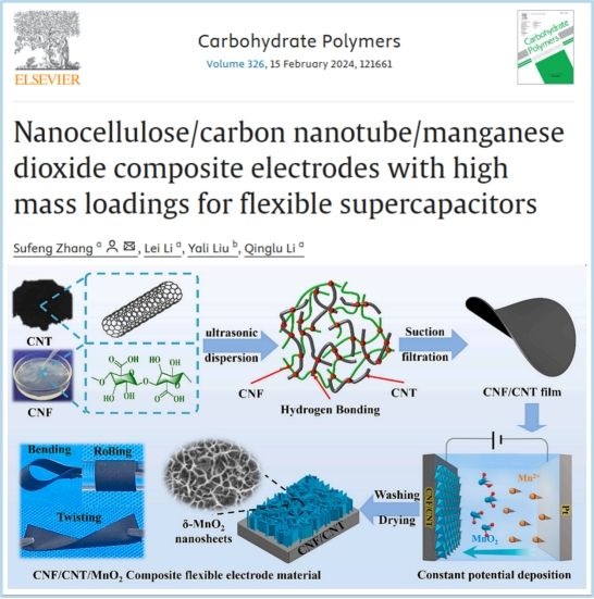 同時(shí),研究了一種通過(guò)電化學(xué)沉積高質(zhì)量二氧化錳(MnO2)到納米纖維素(CNF)和碳納米管(CNT)導(dǎo)電膜表面的方法來(lái)構(gòu)建具有高電容和機(jī)械性能的柔性復(fù)合電極材料。相關(guān)研究成果以“Nanocellulose/carbon nanotube/manganese dioxide composite electrodes with high mass loadings for flexible supercapacitors”為題發(fā)表國(guó)際期刊Carbohydrate Polymers(文章鏈接:https://doi.org/10.1016/j.carbpol.2023.121661)。