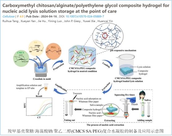 本課題組唐蕊華副教授在紙基傳感器檢測(cè)研究方面取得一定進(jìn)展,相關(guān)成果以“Carboxymethyl chitosan/alginate/polyethylene glycol composite hydrogel for nucleic acid lysis solution storage at the point of care”為題發(fā)表在Cellulose期刊(文章鏈接:https://doi.org/10.1007/s10570-024-05889-7)。本研究通過(guò)物理交聯(lián)的方法研發(fā)了一種pH響應(yīng)的羧甲基殼聚糖/海藻酸鈉/聚乙二醇(CMCS/SA/PEG)復(fù)合水凝膠,采用干浸漬法儲(chǔ)存樣品裂解液。結(jié)果表明:CMCS/水楊酸/聚乙二醇6000復(fù)合水凝膠具有較大的孔徑(256.58±5.58微米)、良好的濕強(qiáng)度(282.3 Kpa)、優(yōu)異的溶脹率(706.91±6.69%)、較高的吸水倍率 負(fù)載量(90.46±1.13%),降解良好容量(77.87±1.45%)和快速響應(yīng)時(shí)間 (15 s)。此水凝膠可以與濾紙一起集成于注射器中組裝成一種核酸快速提取裝置。