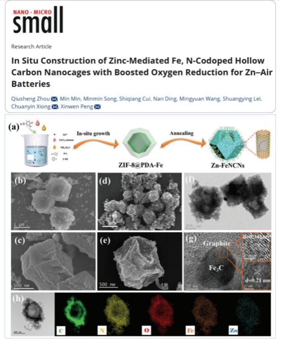 近日,本課題組周秋生副教授在設(shè)計(jì)高性能雙功能氧電催化劑并應(yīng)用于可充電鋅-空氣電池方面取得重要進(jìn)展,相關(guān)成果以“In Situ construction of zinc-mediated Fe, N-codoped hollow carbon nanocages with boosted oxygen reduction for Zn air batteries”為題發(fā)表在Small期刊(文章鏈接:https://doi.org/10.1002/smll.202307943)。本文通過(guò)熱解表面聚合鐵摻雜聚多巴胺ZIF-8多面體,合成了鋅誘導(dǎo)的Fe, N共摻雜碳納米籠(Zn-FeNCNs)。理論計(jì)算和實(shí)驗(yàn)結(jié)果均表明,多面體與聚多巴胺之間的強(qiáng)相互作用促進(jìn)了高活性鋅調(diào)制的FeNx位點(diǎn)的演化和電子傳遞,從而提高了氧析反應(yīng)(OER)和氧還原反應(yīng)(ORR)的雙功能催化活性。此外,當(dāng)將該催化劑應(yīng)用于固態(tài)電池時(shí),該器件在不同彎曲角度下表現(xiàn)出優(yōu)異的機(jī)械穩(wěn)定性和較高的往返效率。