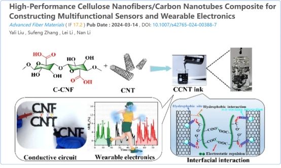 本課題組研究了一種由羧化纖維素納米纖維(C-CNFs)介導(dǎo)的水性碳納米管分散方法。利用CNFs的成膜特性和CCNT的面內(nèi)定向自組裝特性,制備出具有高導(dǎo)電性(67 S cm?1)和高力學(xué)性能(抗拉強(qiáng)度為153 MPa)的復(fù)合自支撐膜。此外,所得的生物基CCNT油墨與各種印刷工藝兼容,并適應(yīng)各種承印物。相關(guān)研究成果以“High-performance cellulose nanofibers/carbon nanotubes composite for constructing multifunctional sensors and wearable electronics”為題發(fā)表在國(guó)際期刊Advanced Fiber Materials(文章鏈接:https://doi.org/10.1007/s42765-024-00388-7)。