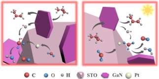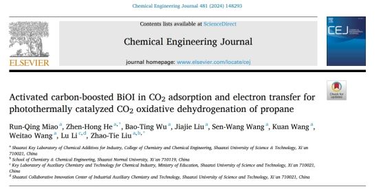此外,為了降低CO2-ODHP反應(yīng)溫度,該團(tuán)隊(duì)開發(fā)出Pt-GaN/SrTiO3和BiOI/AC催化劑,利用光和熱的協(xié)同優(yōu)勢(shì),在相對(duì)較低的溫度下(300 °C)實(shí)現(xiàn)該反應(yīng),首次報(bào)道了Pt-GaN/SrTiO3光熱催化CO2氧化丙烷脫氫反應(yīng),揭示出GaN和Pt分別為C-H和C=O的活化中心;同時(shí)表明CO2在光熱和熱的條件下有不同的轉(zhuǎn)化路徑;揭示了反應(yīng)機(jī)理是丙烷直接脫氫耦合逆水煤氣反應(yīng)。相關(guān)工作分別以“Photothermal catalytic CO2 oxidative dehydrogenation of propane over a dual functional Pt-GaN/SrTiO3 catalyst”和“Activated carbon-boosted BiOI in CO2 adsorption and electron transfer for photothermally catalyzed CO2 oxidative dehydrogenation of propane”為題在Applied Catalysis B: Environment and Energy(IF=20.3)和Chemical Engineering Journal(IF=13.4)期刊上發(fā)表。論文均以陜西科技大學(xué)為第一通訊單位,博士研究生王森望和碩士研究生苗潤(rùn)青分別為論文的第一作者,何珍紅教授和劉昭鐵教授為通訊作者。