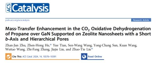 CO2氧化丙烷脫氫反應(yīng)(CO2-ODHP)不僅能生產(chǎn)大量丙烯,還能實(shí)現(xiàn)CO2減排和資源化回收,具有非常重要的意義。然而,該反應(yīng)在高溫條件下(>500 ℃)進(jìn)行,催化劑積碳是導(dǎo)致其失活的重要因素,也是高溫催化反應(yīng)中面臨的常見難題之一。圍繞該問題,課題組開發(fā)出具有微孔、中孔和大孔的片狀分子篩,并負(fù)載GaN制備出具有多級(jí)孔納米片結(jié)構(gòu)特征的GaN/HNS-1催化劑,能夠高效催化CO2-ODHP反應(yīng)進(jìn)行,同時(shí)能夠顯著降低失活速率。DFT理論計(jì)算和原位DRIFTS證實(shí),該反應(yīng)涉及直接脫氫(DHP)和逆水煤氣變換反應(yīng)(RWGS),尤其是采用的多級(jí)孔片層分子篩催化劑能夠顯著增加氣體分子傳質(zhì)擴(kuò)散效率,促進(jìn)積碳前驅(qū)體的快速轉(zhuǎn)移,從而顯著提高催化性能。相關(guān)研究工作以“Mass-transfer enhancement in the CO2 oxidative dehydrogenation of propane over GaN supported on zeolite nanosheets with a short b-axis and hierarchical pores”為題發(fā)表在催化領(lǐng)域國際著名期刊ACS Catalysis(影響因子IF=11.7)上。我校碩士研究生朱占軍為第一作者,何珍紅教授和劉昭鐵教授為共同通訊作者,陜西科技大學(xué)為第一通訊單位,陜西師范大學(xué)為共同通訊單位。